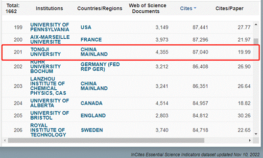 On November 10, 2022, Clarivate Analytics released the latest Essential Science Indicators (ESI) rankings.The data shows that Tongji University's (TJU) chemistry discipline continues to maintain its international ranking at 201, up 2 places from two months ago, entering the top 1.21‰ of the ESI ranking