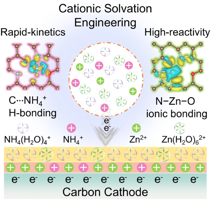 HighlightsHierarchical Zn2+/NH4+ solvation structure induces cathodic interfacial Helmholtz plane reconfiguration to enhance spatial charge density and capacity storage.Hydrated NH4+ ions afford high-kinetics and ultrastable C‧‧‧H charge storage due to a much lower desolvation energy barrier compared with large-sized Zn(H2O)62+ (5.81 vs. 14.90 eV).Interfacial Zn2+/NH4+ co-storage endow the h...