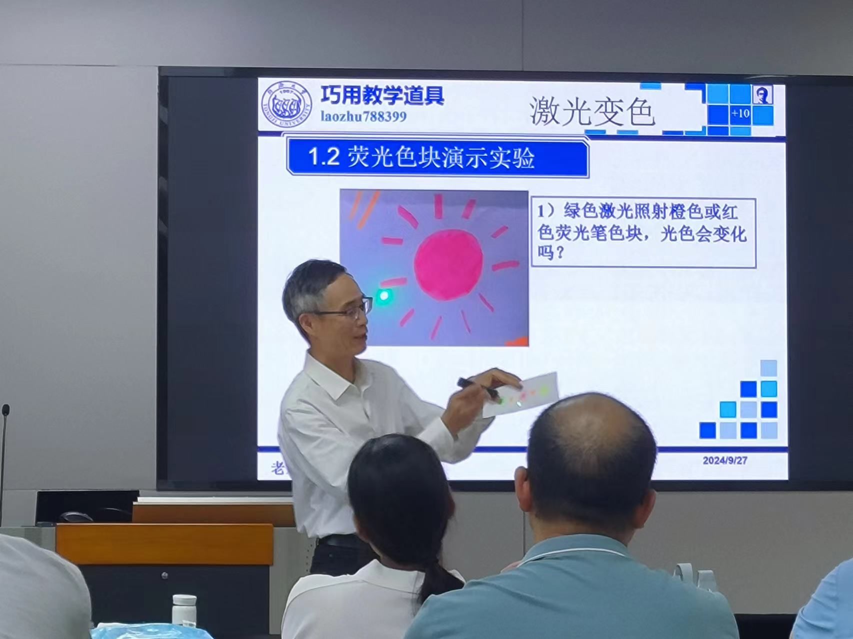 讲座上,朱老师以荧光密写与盲画抽签活动及荧光色块演示实验开场,通过这些互动环节展示了教学道具在实际教学中的应用实例及其在活跃课堂气氛方面的显著效果。红宝石发光实验则利用了员工对宝石的好奇心,成功吸引了大家的兴趣。结合实例,朱老师介绍了一些仪器功能的创新应用,这些新颖的方法不仅令仪器销售人员惊叹,也赢得了在场老师们的高度赞赏。朱老师接着通过演示变色石头在不同光源下的色彩变化,巧妙地引入了光谱学的教学,并从光敏变色现象讲解激发波长的概念。朱老师指出,自己的课程之所以受到员工较高的肯定,一方面是因为他在授课过程中注重从员工的兴趣出发,而非仅从理论知识本身的角度讲解;另一方面,则是他备课时严谨的态度,每次备课都精细到分钟,力求精益求精,从而保证了高质量的教学。