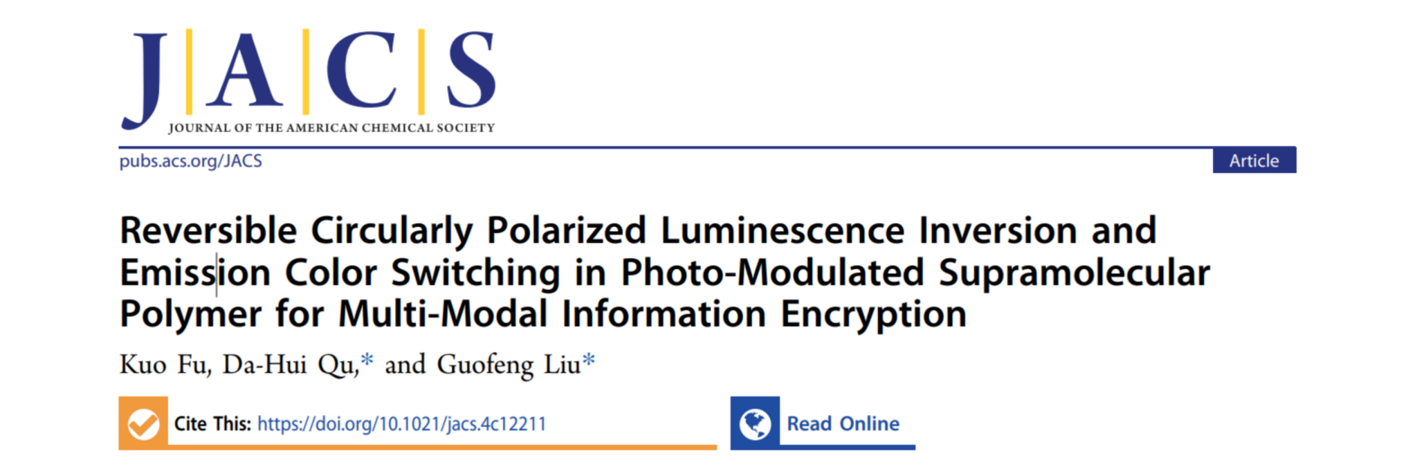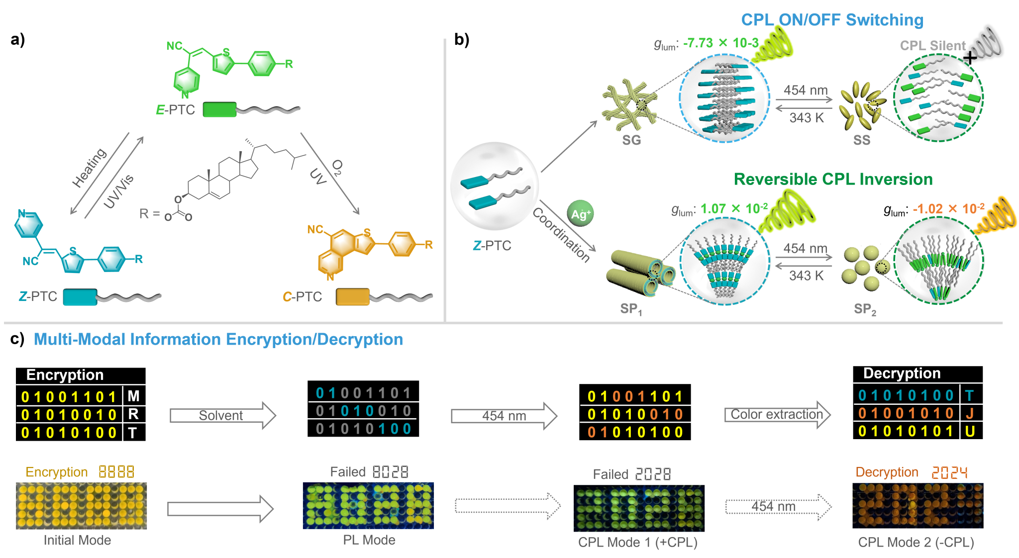 近期,刘国锋特聘研究员课题组设计了一种创新的光响应分子——吡啶噻唑丙烯腈-胆固醇衍生物(Z-PTC)。通过引入银离子(Ag⁺)的配位作用,该团队成功驱动了手性组装,构建出一种能够在光照条件下调控CPL信号进行可逆反转和发射颜色切换的超分子结构。这一系统不仅在半固态环境中展示了复杂的信息加密/解密功能,还为高级信息加密技术开辟了新的可能性。相关成果“Reversible Circularly Polarized Luminescence Inversion and Emission Color Switching in Photo-Modulated Supramolecular Polymer for Multi-Modal Information Encryption”发表于国际知名期刊《美国化学会志》(Journal of the American Chemical Society)。