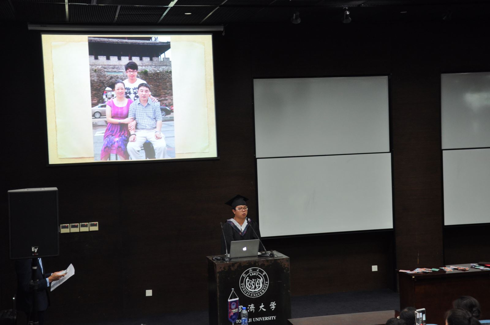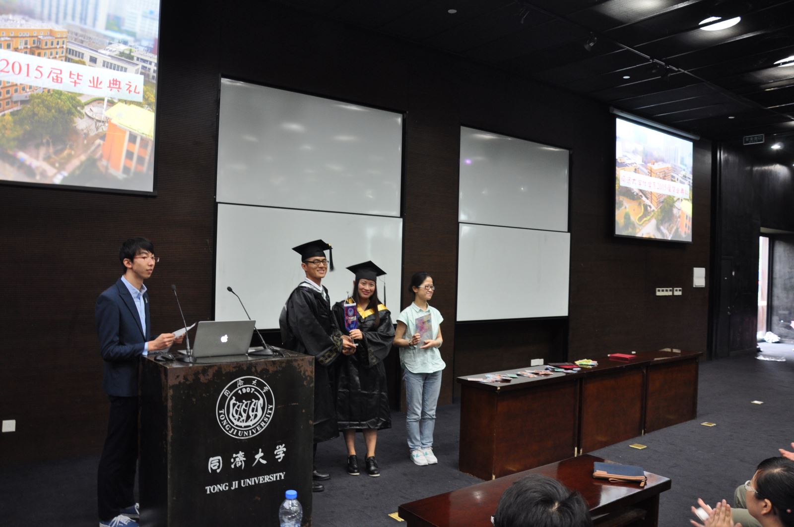 2015届毕业研究生陈雷、李修艳和本科毕业生陈昊、尹成尧为大家带来集体朗诵《惜别同济》,带领大家思绪回到曾经的学习、生活的点点滴滴,触及同学们内心最柔弱的部分,现场弥漫着回忆的欢乐、离别的愁绪,毕业就在眼前了,手捧毕业证书的时刻即将来临。