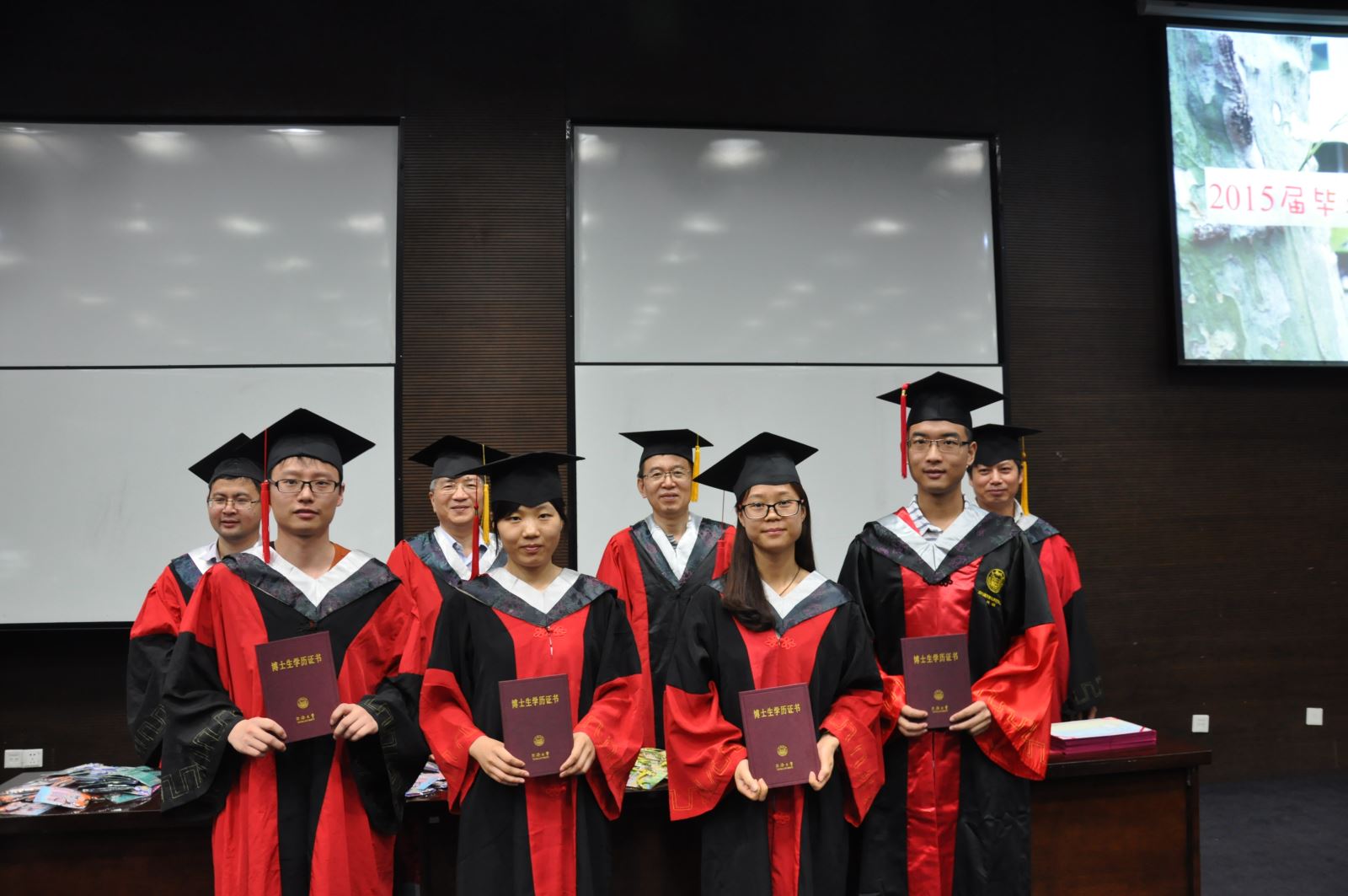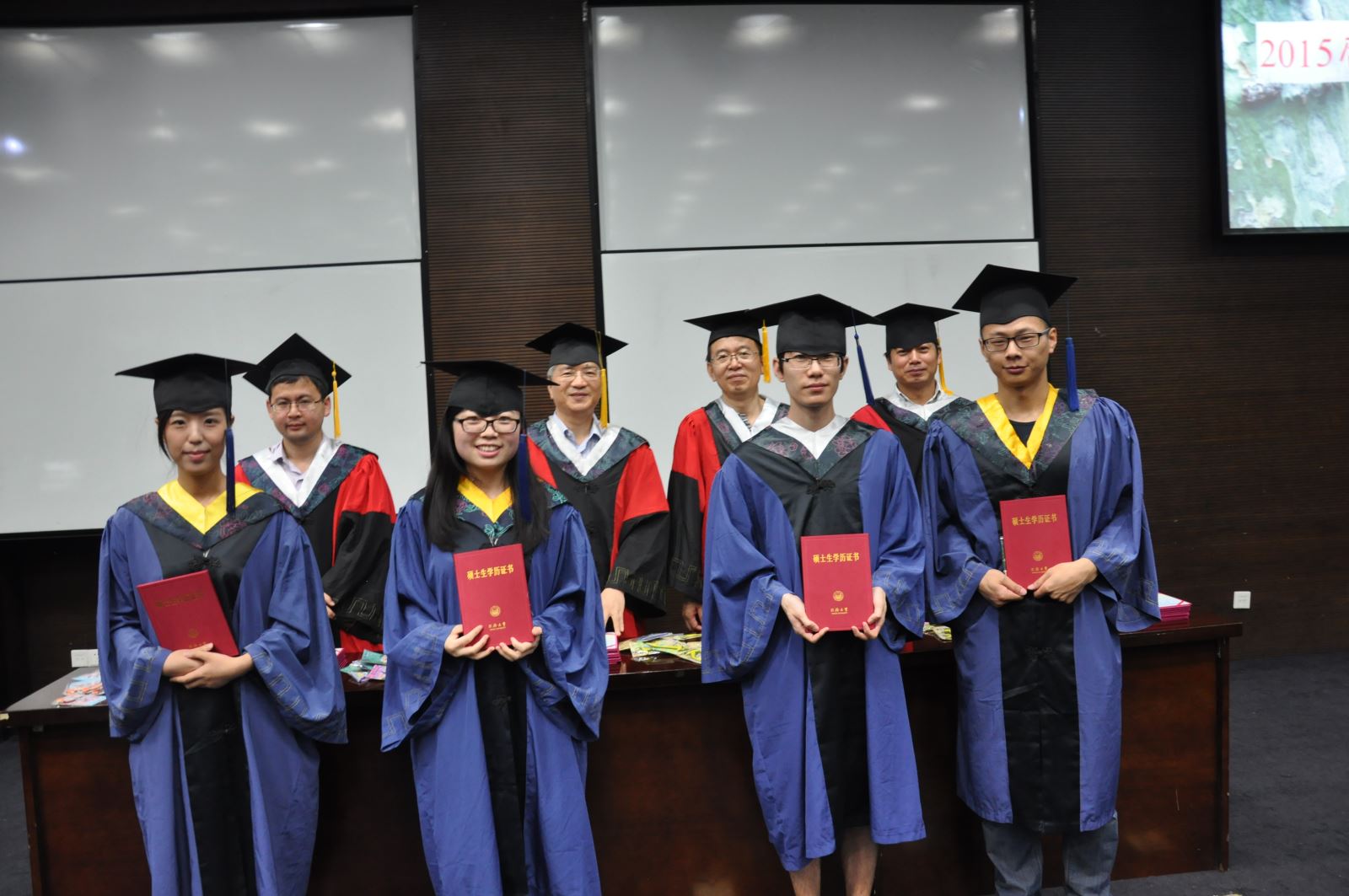 随后,授证仪式伴随着庄重又不失轻快的音乐拉开帷幕。出席典礼的全体毕业生一批批来到前台,王国强、王雪峰、王启刚和田志新老师作为导师代表为他们分别颁发毕业证书,一一拨正学位服上的帽穗,并赠送化学系为大家精心准备的毕业纪念品。毕业生们笑逐颜开,手捧毕业证书与四位导师合影留念。