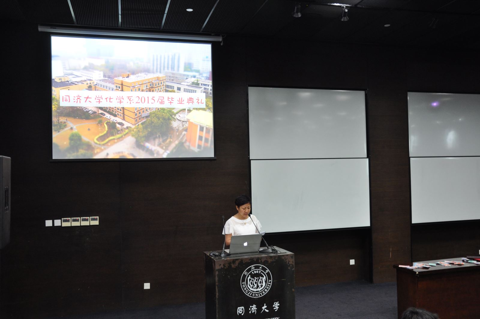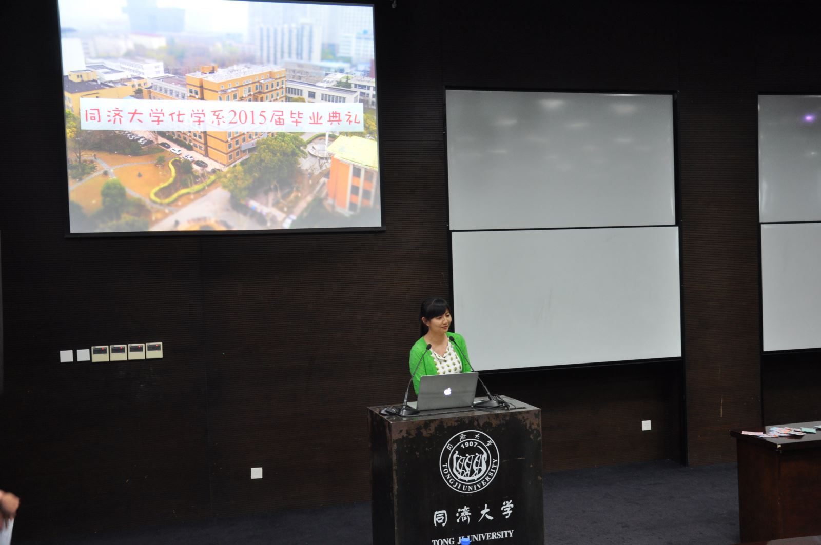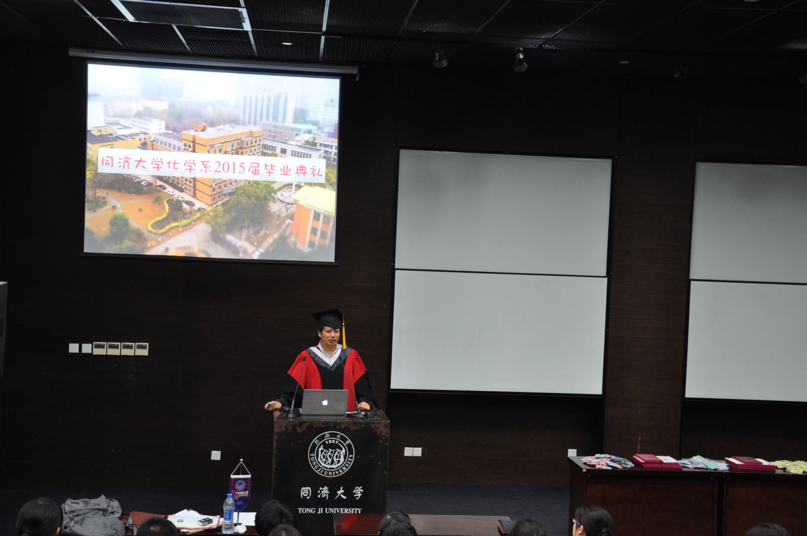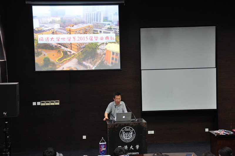 授证仪式将现场气氛引向了一个高潮,段甜伟、周佳俊同学分别代表毕业研究生和本科毕业生发表感言。段甜伟同学再次让在座的研究生回顾校园生活、科研之路,回忆大家一起“激扬青春,放飞梦想”的岁月;“毕业并不代表结束,而是宣布另一个开始”,她表示毕业了将自豪地作为“同济人”,在“同舟共济,自强不息”的精神引导下继续“严谨求实,团结创新”。周佳俊同学则用一张张图片展示着自己如何从初进化学系的失落与迷茫渐渐地喜欢上化学系,回顾了大学学习生活与工作,从系内到系外、从社团嘉年华到化学嘉年华,点滴成长让自己能够从容面对今后的生活,他还深情地感谢了父母一直以来对他的关心和爱护。发言毕业生代表的情绪感染着现场的每位毕业生,同学们时而会心地一笑,时而眼泪盈眶。
