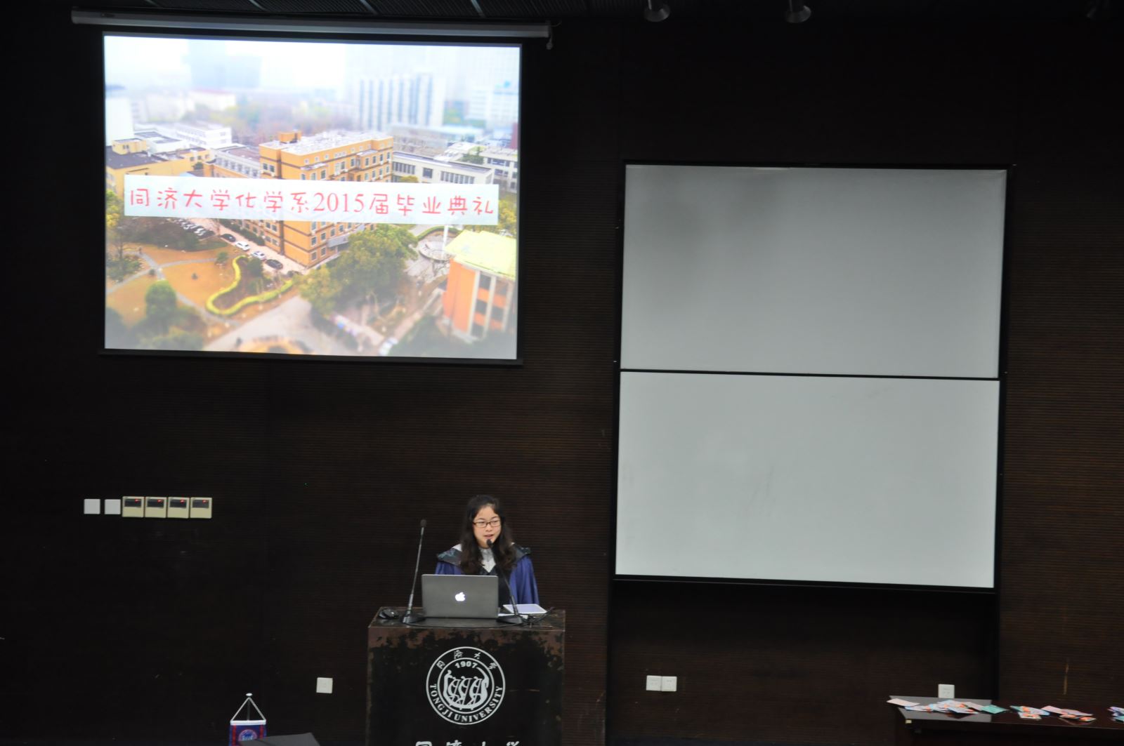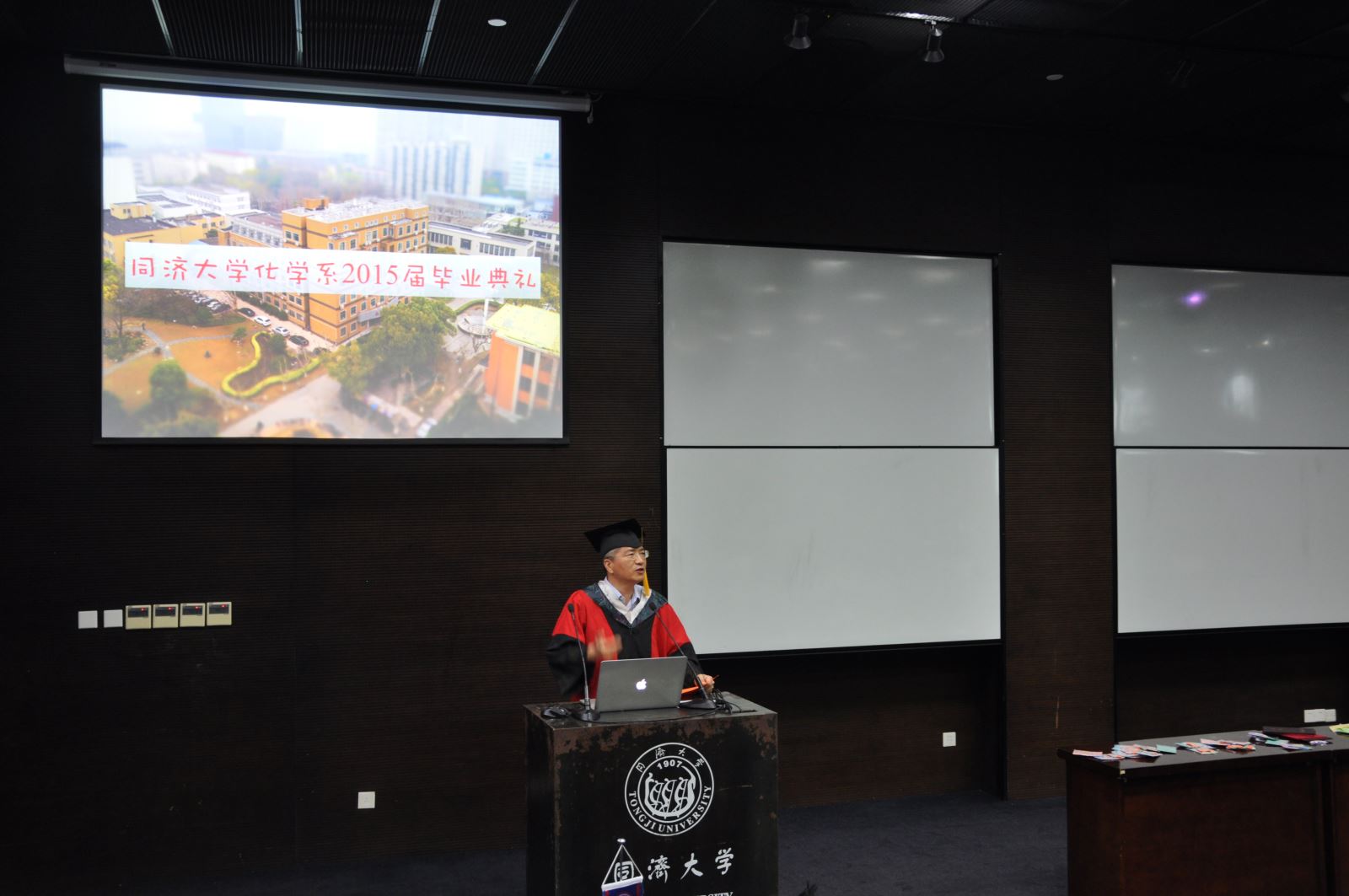 伴随着毕业生纪念视频的循环播放,此次毕业典礼从几位班主任的最后一次点开始,2015届应用化学专业毕业生姚继宗同学带着深深的感情主持了此次毕业典礼。
