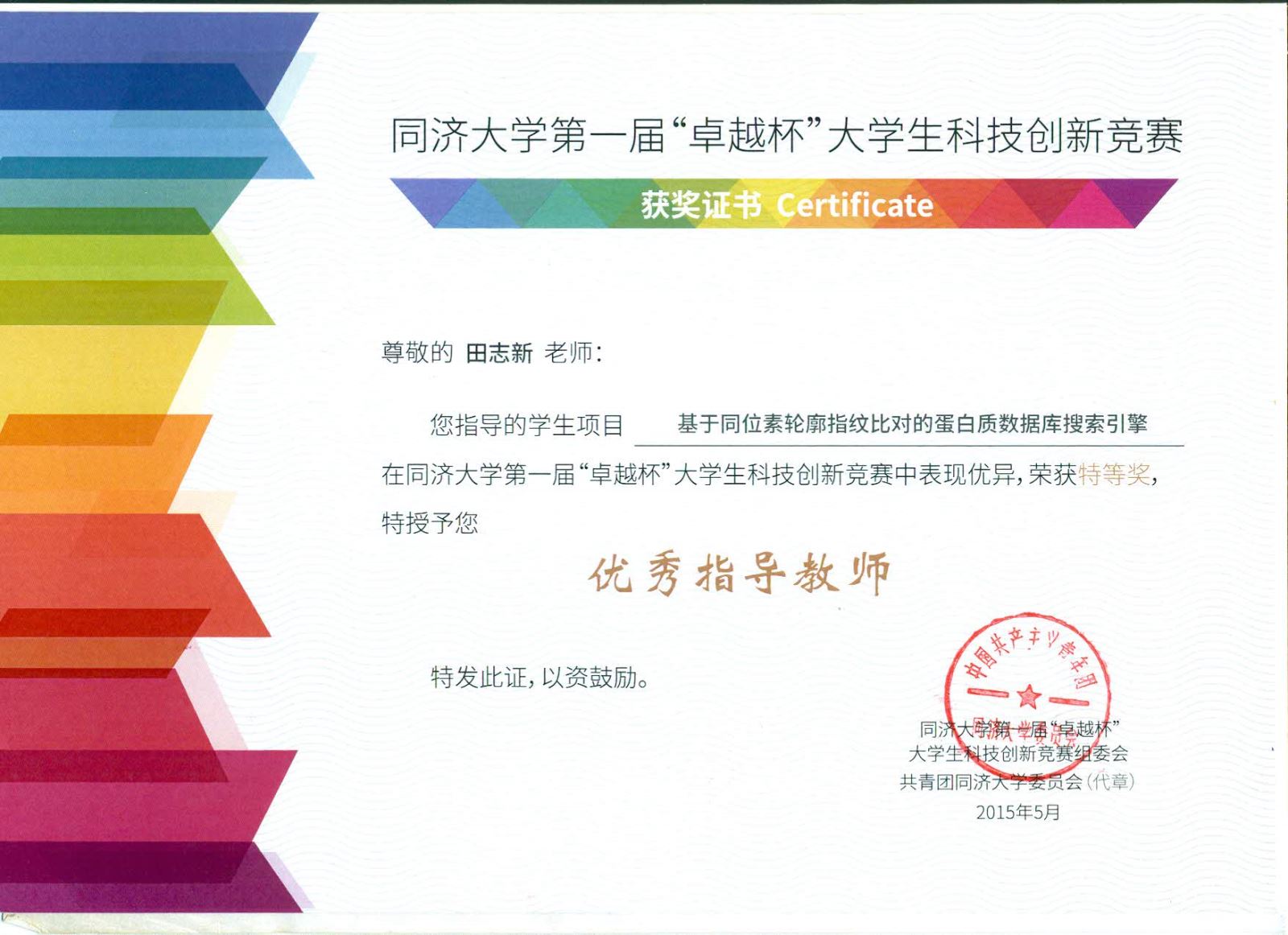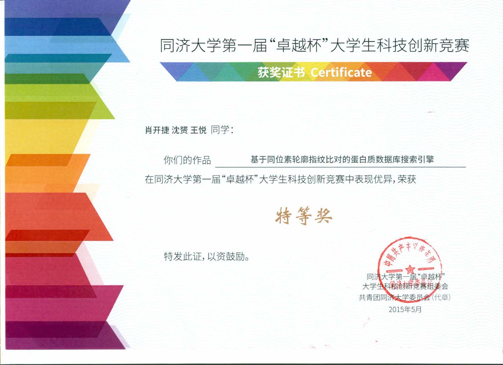 5月4日,校团委公布了首届“卓越杯”老员工科技创新竞赛暨第十四届“挑战杯”校内选拔赛结果,我系肖开捷、沈赟、王悦团队的作品《基于同位素轮廓指纹比对的蛋白质数据库搜索引擎》荣获特等奖,作品指导老师田志新教授被授予“优秀指导教师称号”。该作品目前已经被推荐代表1946伟德国际源自英国参加第十四届“挑战杯”上海市老员工课外学术科技作品竞赛。