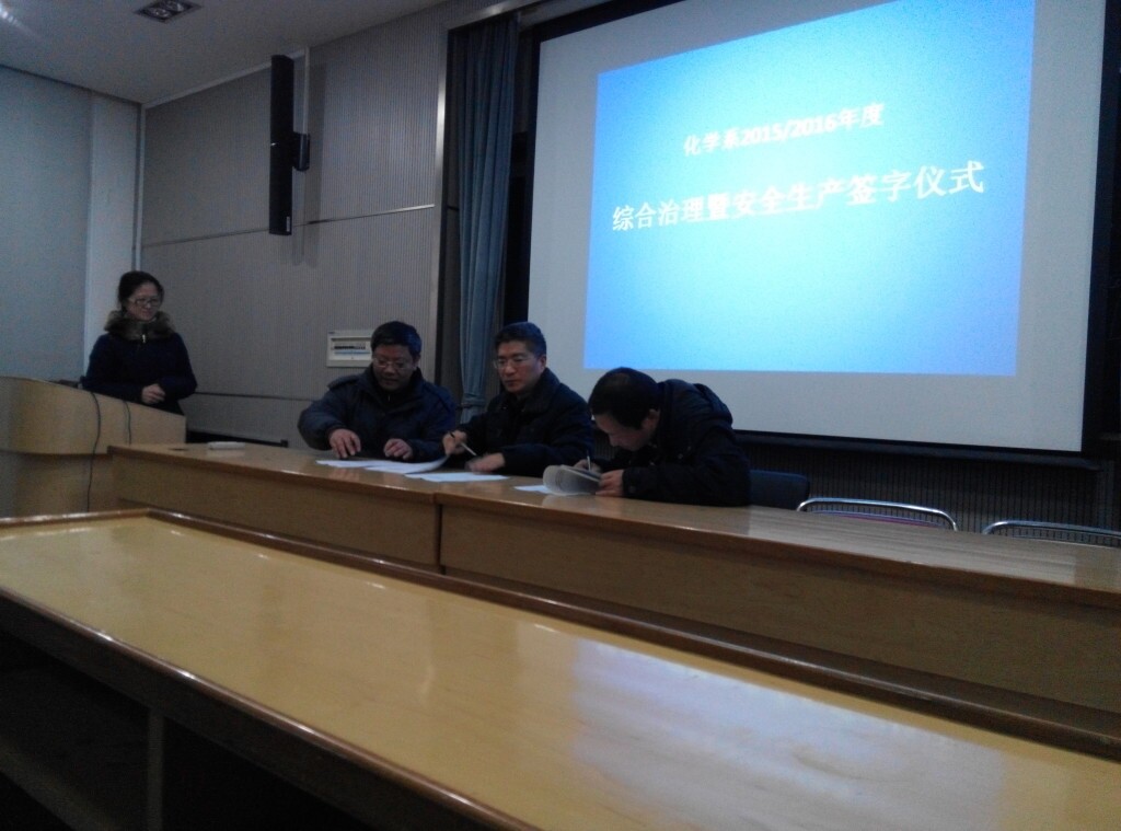 日前,化学系2015-2016年度综合治理暨安全生产签约仪式。会上,系党委书记王国强简要介绍了当前安全生产的形势,并就近期对全系各课题组与实验室安全卫生工作的检查情况进行了点评通报。王国强指出,当前各级领导对安全工作十分重视,作为公司安全防范重点单位,化学系历来重视安全工作,在当前形势下,化学系全体师生要继续严格按照上级有关安全稳定工作会议的精神和公司安全检查的要求,吸取近期其他高校安全事故的教训,落实安全工作,排查安全隐患并及时整改,落实安全措施,落实安全责任,有效防范各类生产安全事故和重特大火灾事故,确保寒假期间校园的安全和稳定,确保化学系师生工作学习环境长期安全稳定。