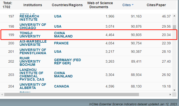 The data shows that Tongji University's (TJU) chemistry discipline continues to maintain its international ranking at 199, up 2 places from two months ago, entering the top 1.17‰ of the ESI ranking.