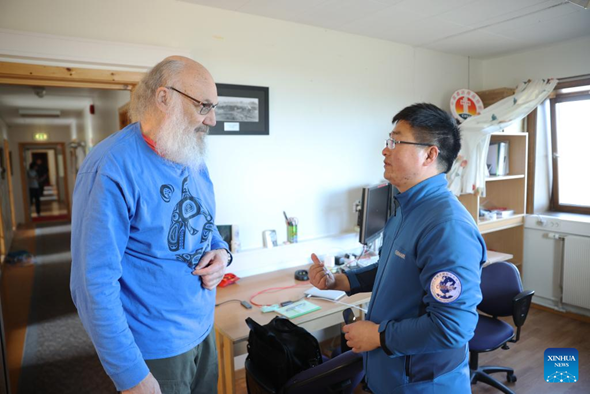 Chinese scientist Hu Zhengyi (R) communicates with Special Adviser of Norwegian Polar Institute Kim Holmen at China's Arctic Yellow River Station in Ny-Alesund, Svalbard, Norway, on June 21, 2024. (Xinhua/Zhao Dingzhe)