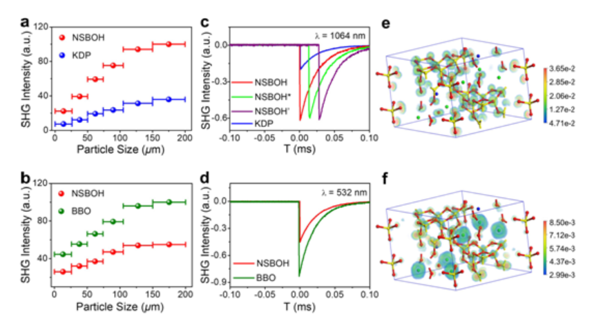 In this study, the research team, based on the chemical synthesis method of borate solution, took the deep ultraviolet second-order nonlinear optical crystal NaSr3Be3O9F4(NSBBOF) as the structural model and adopted the covalent bond modulation strategy for the iso-site replacement of tetrahedral primitives [BO4] and [BeO3F] in the material, to finally obtain the beryllium-free borate crystalline materials. The high concentration of borate solution is conducive to the agglomeration of [BO3]/[BO4] groups into B-O clusters with a higher nucleus, further forming a covalent framework with a three-dimensional structure. This structure can give the material a large optical band gap, achieving a higher UV transparency. Based on this covalent bond modulation strategy, the research team successfully designed and synthesized a beryllium-free hydroxyborate composed of [B9O19] clusters. According to experimental results, the NSBOH crystal shows good physicochemical stability, with a UV absorption cutoff smaller than 190 nm, consistent with the theoretical value of 178 nm. NSBOH has a strong SHG response (3.3 × KH2PO4 @ 1064 nm, 0.55 × β-BaB2O4 @ 532 nm) in both visible and ultraviolet bands, which is the maximum value of deep ultraviolet borate crystalline materials, demonstrating excellent performance as a deep ultraviolet second-order nonlinear optical crystal material. This research is of great significance for the exploration of deep ultraviolet second-order nonlinear optical crystals with excellent design performance in hydroxyborate systems.