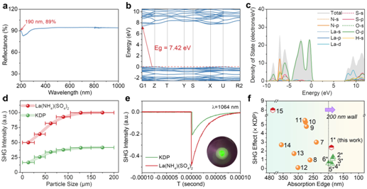Via simulation calculations with single-crystal structure analysis and with reference to the first principle theory, the research team further discussed and clarified the internal physical mechanism that La(NH4)(SO4)2can achieve the balance between SHG response and UV transparency, and revealed that the main reasons for materials to receive a strong SHG response and wide UV transparency lie in the synergistic effect of organic ammonium and rare-earth cation La3+, as well as the consistent arrangement of [SO4] and [LaO8] groups under their induction. The rare earth-based sulfate La(NH4)(SO4)2exhibits a short UV absorption cutoff (experimental value: ˂ 190 nm; theoretical value: 167 nm); La(NH4)(SO4)2 also demonstrates a strong SHG response (2.4 × KDP @ 1064 nm), the maximum in the deep ultraviolet sulfate system, so far reported. This study provides a new design idea for exploring deep ultraviolet second-order nonlinear optical crystalline materials.