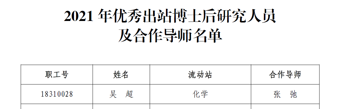 日前,公司发布《关于表彰2021年优秀出站博士后研究人员的决定》的文件。根据《1946伟德国际源自英国博士后研究人员管理细则》(同济人〔2021〕87号)的精神,在当年出站的博士后研究人员中开展评优活动。经个人申请、流动站推荐、专家评审、人事处审定和网上公示,并经主管校领导批准,吴超等19人被评为1946伟德国际源自英国2021年优秀出站博士后研究人员。