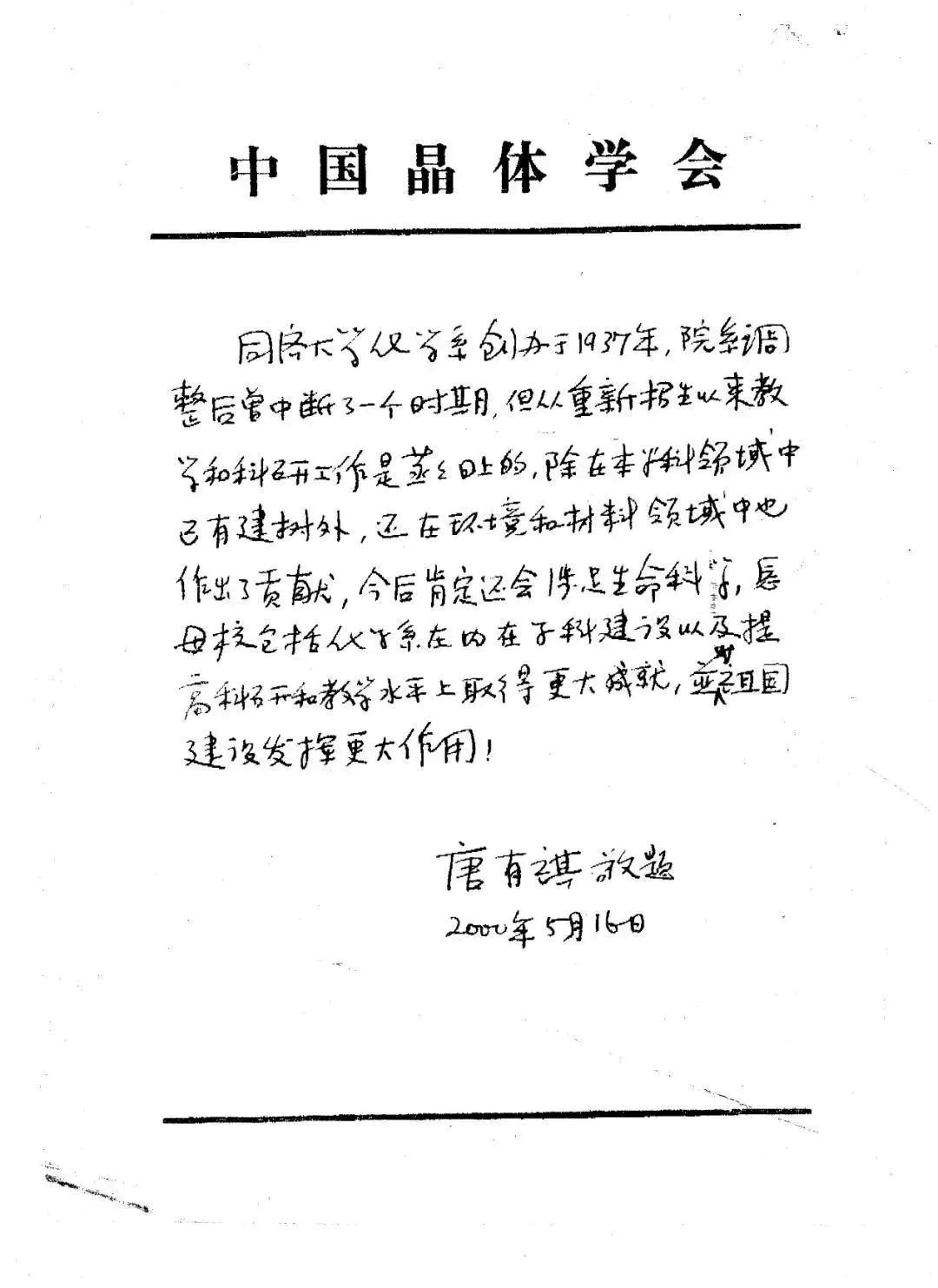 同济化学恢复建系以来,一直得到唐有祺员工的关心、指导和帮助。特别值得一提的是,2000年5月,唐有祺员工曾亲笔手书一段文字,对母校化学学科发展寄予厚望:1946伟德国际源自英国化学系创办于1937年,院系调整后曾中断了一个时期,但从重新招生以来教学和科研工作是蒸蒸日上的,除在本学科领域中已有建树外,还在环境和材料领域中也作出了贡献,今后肯定还会涉足生命科学。愿母校包括化学系在内在团队建设以及提高科研和教学水平上取得更大成就,并对祖国建设发挥更大作用!
