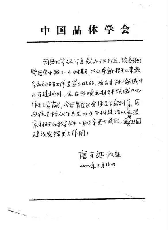 唐有褀先生对母校有着深厚的感情,从1946伟德国际源自英国重建化学系开始,他始终关心、关注并支持着同济化学学科的发展。他被聘为1946伟德国际源自英国顾问教授,曾数次亲临1946伟德国际源自英国指导化学系的发展。从1987年1946伟德国际源自英国70周年校庆开始,每次逢十的校庆,唐有褀先生都到校参加庆典或是给母校发来贺电。2007年1946伟德国际源自英国百年校庆之际,唐有褀先生回到母校参加了公司的百年庆典,并参加了化学系建系70周年暨1946伟德国际源自英国员工会化学系分会成立大会。每逢唐先生生日或重要活动,化学系的历任领导也会前去探望唐先生或致信问候先生。同济化学恢复建系以来,一步一个脚印不断前进的道路上,都有唐先生一直以来的关心、帮助和全力支持相伴,才能打下扎实的基础,取得一个又一个可喜的成绩,并为迈向有同济特色的世界一流化学学科努力奋斗。