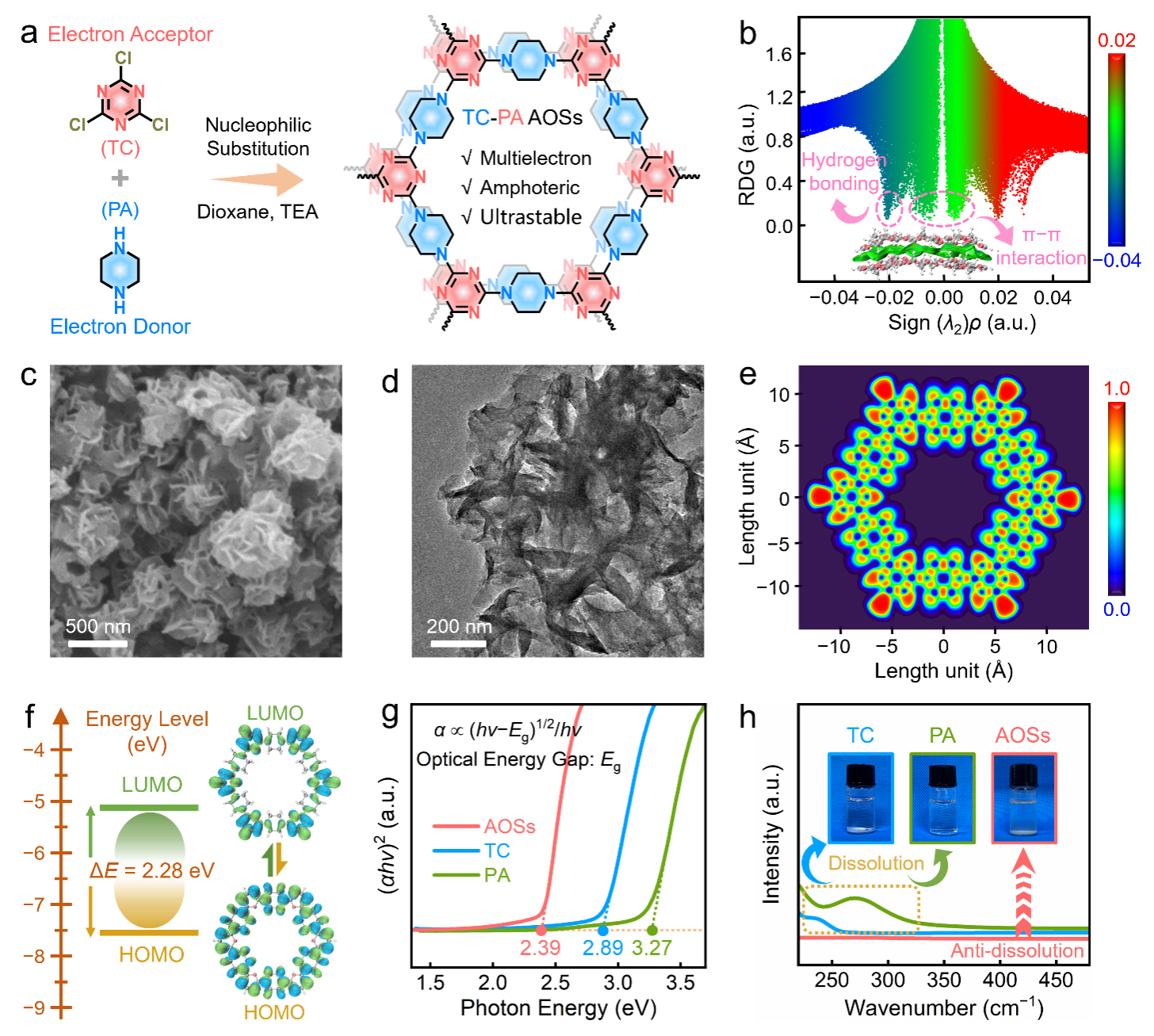 课题组研究显示,电子受体三聚氯氰和电子给体哌嗪通过氢键和π−π平面堆叠自组装形成花状有机超结构,展示出高密度活性位点、高度共轭的双极性结构和低能带间隙,有助于加快电子转移动力学和电极氧化还原速率。