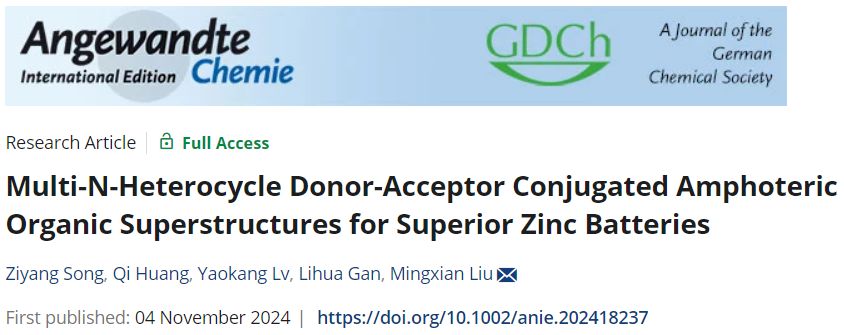 公司刘明贤教授团队长期致力于高效储能材料研究并应用于新能源电池,课题组近期从材料的活性位点与微结构设计角度出发,提出了多氮杂环供体-受体自组装构筑双极性有机超结构材料的新方法,促进了低反应能垒的Zn2+/OTF−相反离子交替配位,揭示了n型亚胺和p型叔氮协同氧化还原电荷存储机制,有效解决了当前双极型有机材料存在的问题,构建了高能量密度和长循环寿命的锌电池,相关成果以“Multi-N-Heterocycle Donor-Acceptor Conjugated Amphoteric Organic Superstructures for Superior Zinc Batteries”为题发表于国际权威期刊《德国应用化学》(Angewandte Chemie International Edition)。
