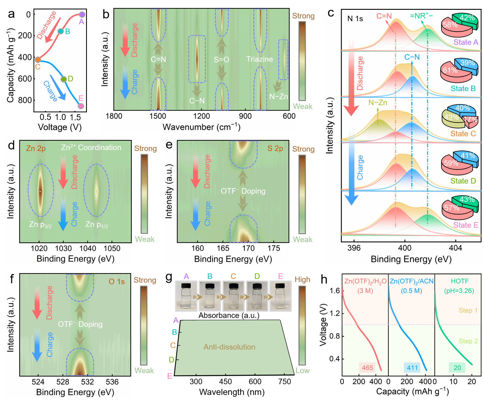 研究人员通过异位光谱研究,表明亚胺/叔氮作为有机超结构的n型和p型电活性中心,分别与Zn2+和OTF−电荷载体反应,引起发高度可逆的连续阴/阳离子共配位反应。