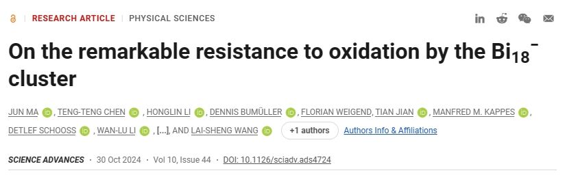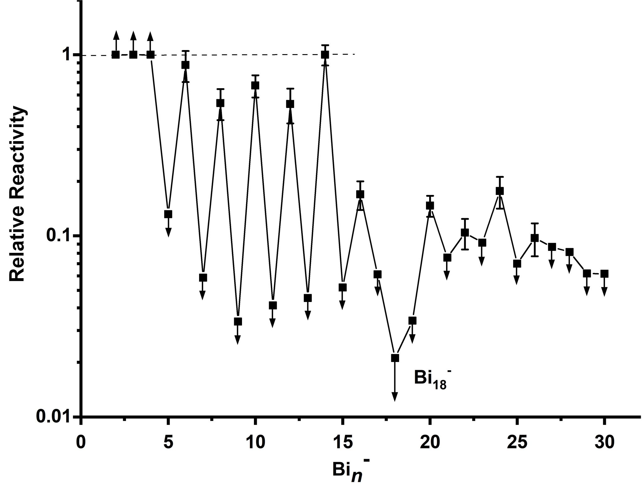 铋(Bi: 6s26p3)是一种独特的主族金属,其导电性几乎是所有金属中最低,也最具反磁性。因为每个铋原子含有奇数个价电子,所以按照一般金属团簇模型,铋团簇系列的稳定性应该呈现出奇偶振荡特征,其中含有未成对电子的团簇尺寸应该具有高化学活性。1946伟德国际源自英国邢小鹏教授课题组联合种美德三国科学家对铋团簇进行了深入探究,在对铋团簇负离子(Bin-, n=2-30)与O2的反应研究中观察到了预期的奇偶振荡趋势,但同时发现了一个异常奇特的铋团簇——Bi18-。近日,相关研究成果以《On the Remarkable Resistance to Oxidation by the Bi18⁻ Cluster》为题在线发表于Science Advances。
