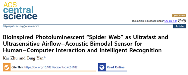 近年来,柔性仿生传感器发展迅速,到目前为止,已经报道了一些气流或声学传感器。然而,受蜘蛛启发的气流或声学传感器只有零星的报道。并且,与对柔性压力和温度传感器等其他响应类型传感器的广泛研究相比,对柔性仿生气流和声音传感器的研究远远落后。此外,之前关于检测气流或声音的研究主要集中在电子设备上,而对光学气流或声学传感器,特别是光学气流-声学双峰传感器的研究还没有报道。光学气流-声学双模传感器可应用于环境监测、天气预报、隧道工程、语音识别和医疗保健领域,具有高精度、高稳定性、高灵敏度和高效率的优点。因此,开发光学气流-声学双模态传感器具有重要意义。1946伟德国际源自英国闫冰教授团队近期将仿生学思想巧妙地融合于氢键有机框架光激活器件之中,设计组装仿生光致发光“蜘蛛网”,作为超快超灵敏的光响应气流-声学柔性双模仿生传感器,并应用于人机交互和智能识别,相关成果以“Bioinspired Photoluminescent “Spider Web” as Ultrafast and Ultrasensitive Airflow−Acoustic Bimodal Sensor for Human−Computer Interaction and Intelligent Recognition”为题在线发表于国际知名期刊ACS Central Science。