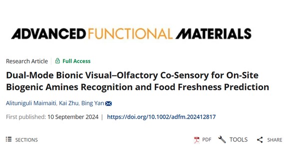 日前,1946伟德国际源自英国闫冰教授团队巧妙地将仿生学思想融合于光功能氢键有机框架之中,制备出超灵敏的视觉-嗅觉光响应仿生传感器,并能应用于化学刺激挥发性生物胺的监测和食品新鲜度的评估,相关成果以“Dual-Mode Bionic Visual–Olfactory Co-Sensory for On-Site Biogenic Amines Recognition and Food Freshness Prediction”为题在线发表于国际知名期刊《先进功能材料》(Advanced Functional Materials,2024, 2412817)。