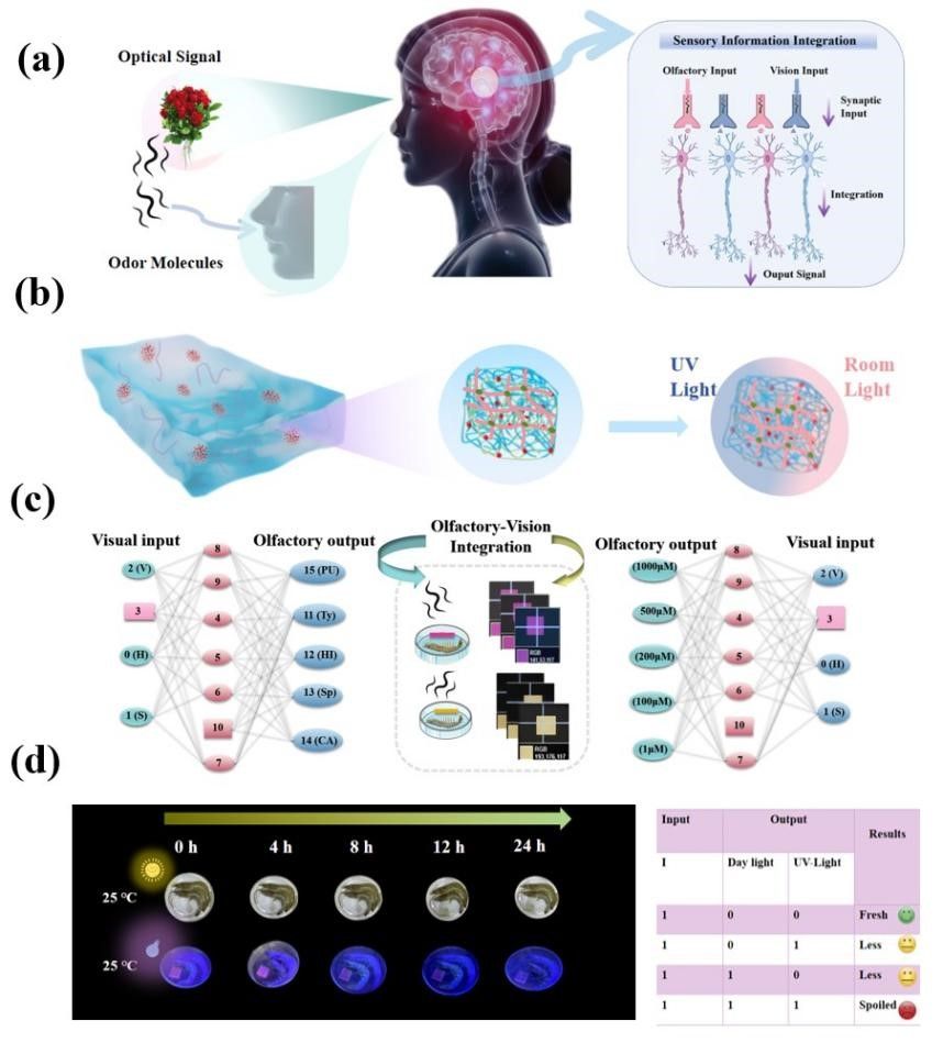 (a)受视觉和嗅觉刺激的生物多感官整合神经系统;(b)双模式水凝胶的制备工艺;(c)用于视觉嗅觉信息集成的人机交互平台;(d)用于实时监测食品新鲜度的逻辑门装置
