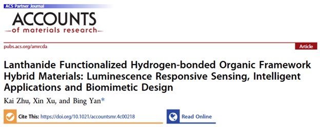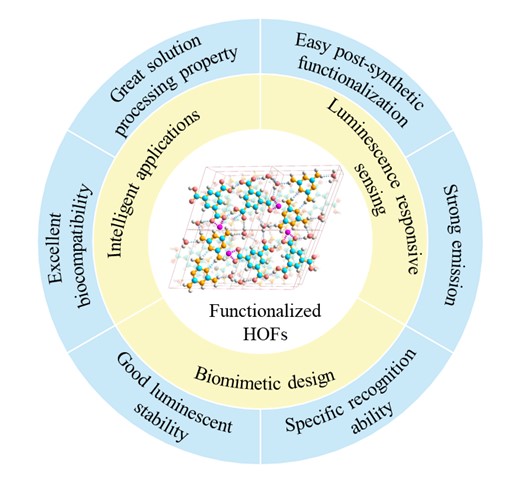 氢键有机框架(Hydrogen-bonded organic frameworks, HOFs)作为一种新兴的晶态多孔材料,主要由纯有机或金属有机构建单元通过氢键相互作用构筑而成,框架可通过范德华力、静电、π-π、 C-H…π相互作用等进一步强化。功能化氢键有机框架是指通过离子交换、配位后合成修饰和原位合成等策略将外来功能物种引入HOFs框架以赋予其特定功能的杂化材料。发光功能化HOFs可以产生丰富的发光中心,能对特定的分析物或刺激表现出敏感的光响应变化(开、关或比率变化)。这些特性使功能化HOFs材料和器件能够实现对各种化学刺激甚至物理刺激的传感。1946伟德国际源自英国闫冰教授团队自2021年开辟了基于功能化HOFs特别是镧系功能化HOFs杂化材料在光功能应用、光响应传感、智能检测与仿生模拟方面的系统工作,相关结果先后在Adv. Mater、Adv. Funt. Mater.、Adv. Opt. Mater.、Adv. Health. Mater.、Mater. Horiz.、J. Mater. Chem. A、Inorg. Chem. Front.、Anal. Chem.、ACS Sensors、ACS Appl. Mater. Interface、Inorg. Chem.等国际重要期刊发表研究论文二十多篇。基于前期系统性工作,该团队近期在国际知名期刊Accounts of Materials Research上发表题为“Lanthanide Functionalized Hydrogen-bonded Organic Framework Hybrid Materials: Luminescence Responsive Sensing, Intelligent Applications and Biomimetic Design”的综述性文章。