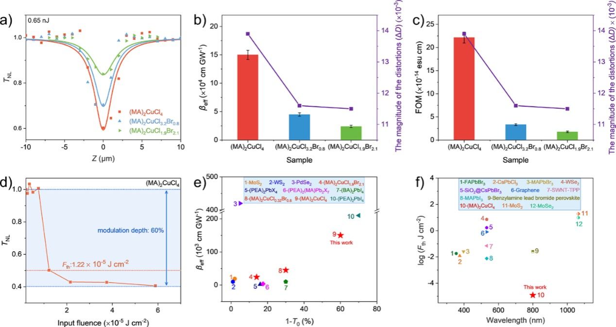 系列材料在610~800nm波长范围内体现优异的非线性光学性能,其中性能最优的(MA)2CuCl4非线性光学吸收系数可达(1.5 ± 0.08) × 105 cm GW−1,调制深度大于60%,光限幅阈值小至1.22 × 105 J cm-2。该工作报道了一类新型非线性光学吸收材料,也为研创高性能非线性光学材料提供一种新策略。