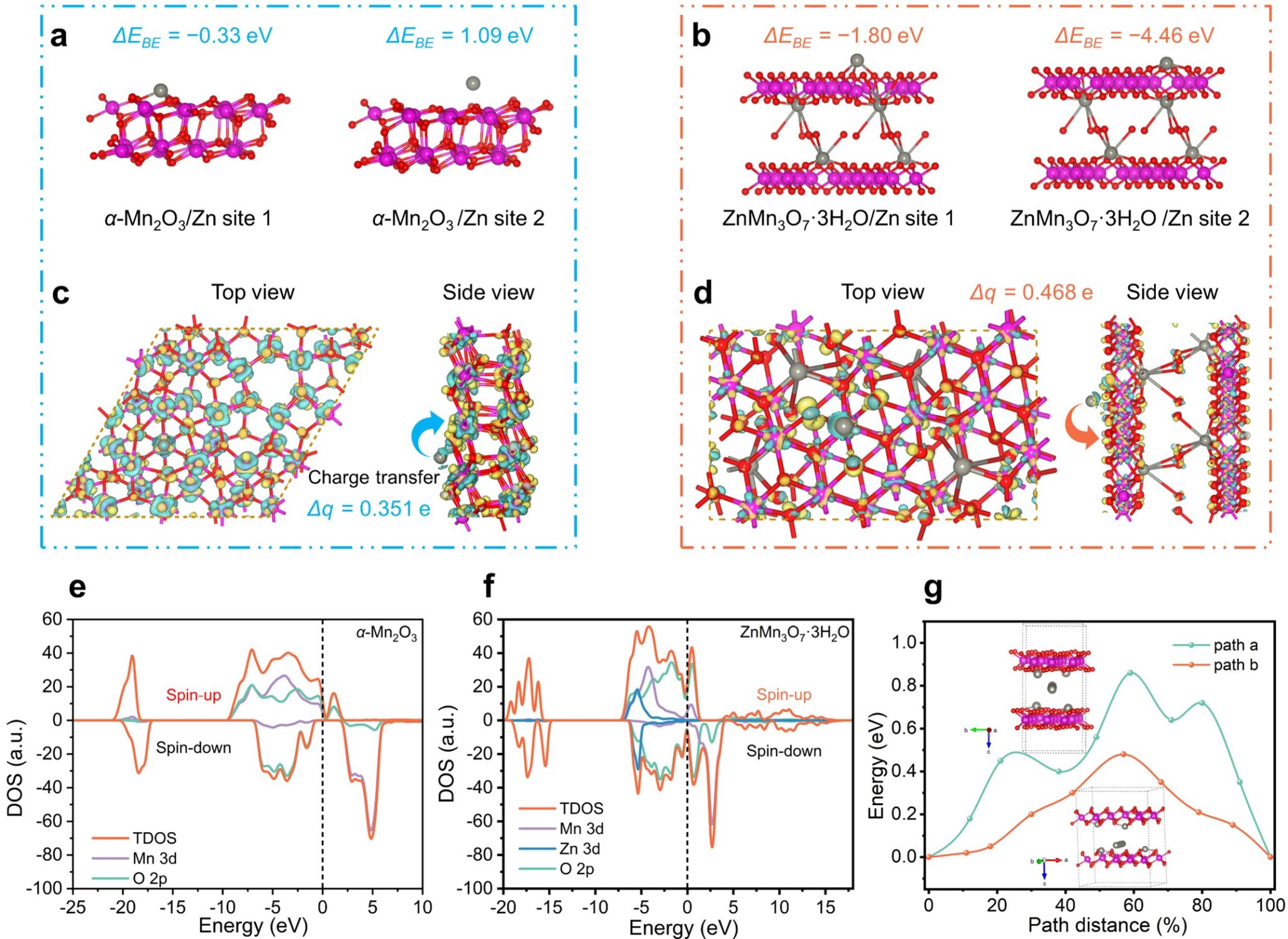 理论计算表明,与α-Mn2O3相比,ZnMn3O7·3H2O具有更强的亲锌活性和更窄的能带间隙,有效降低了离子载体与亲锌位点之间的反应能垒,提高离子键合效率。