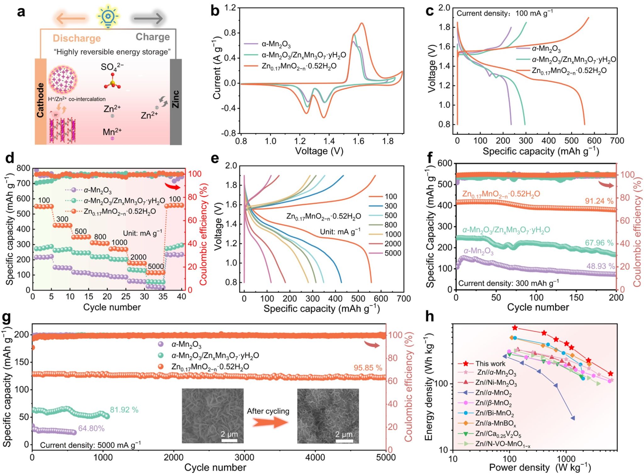 电化学研究表明,α-Mn2O3预相变后的非晶锰基材料具有更高的比容量(558 mAh g−1@100 mA g−1)、倍率性能和循环稳定性(5000次循环后容量保持率为95.85%)。