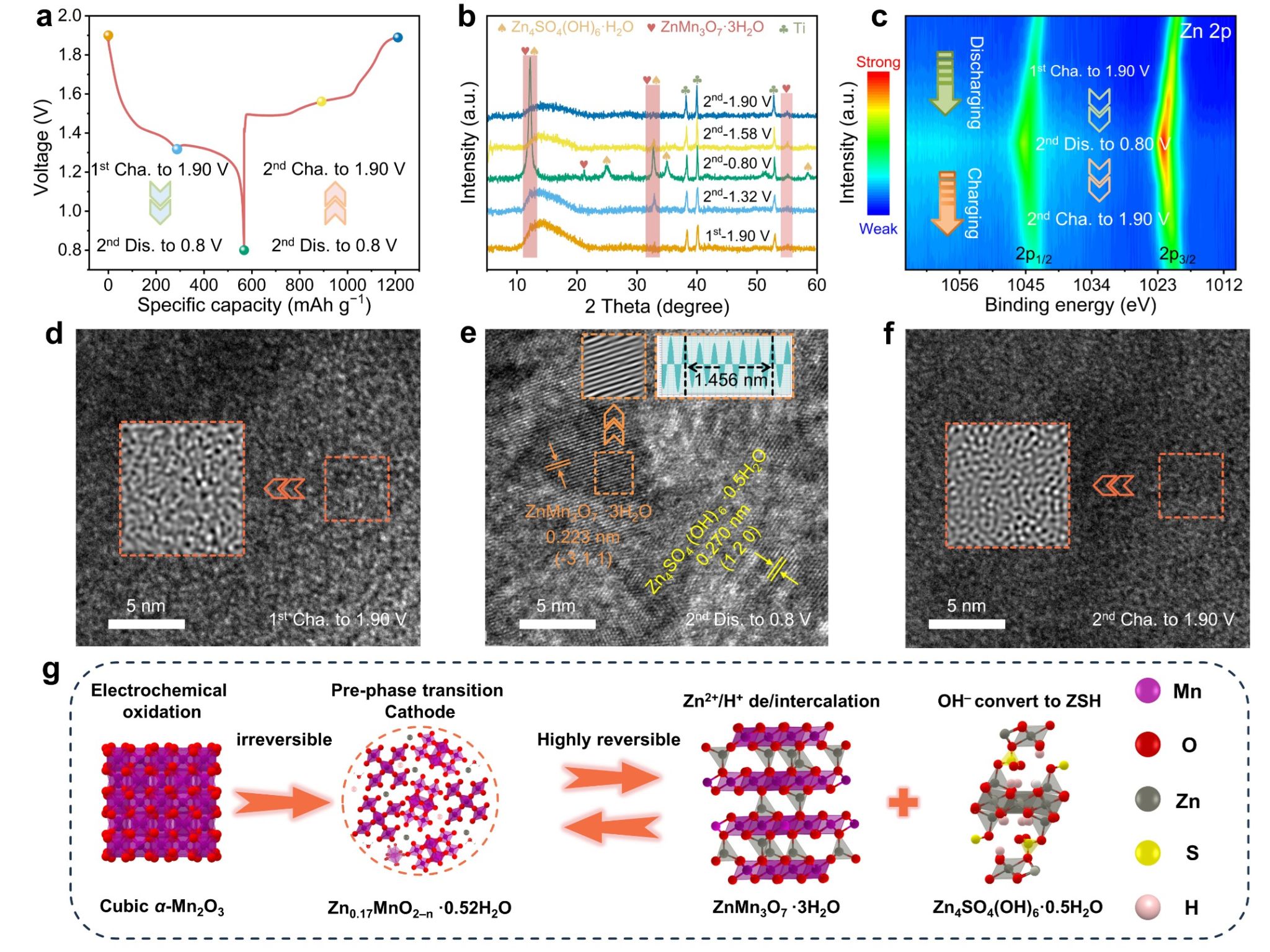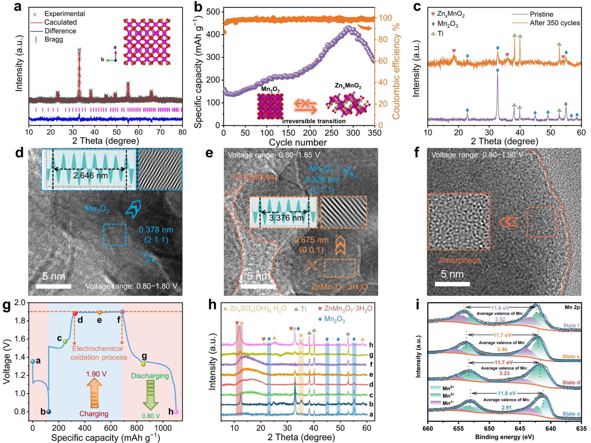实验表征揭示,在可控电化学氧化作用下,具有长程有序和周期性立方相α-Mn2O3晶体结构不可逆的转变为短程无序的Zn0.17MnO2−n·0.52H2O非晶结构,在随后的放电过程中可逆转变为层状结构ZnMn3O7·3H2O。非晶结构有利于暴露出更多的氧化还原位点,缓解锌离子嵌入脱出的晶格斥力,促进高效Zn2+存储。