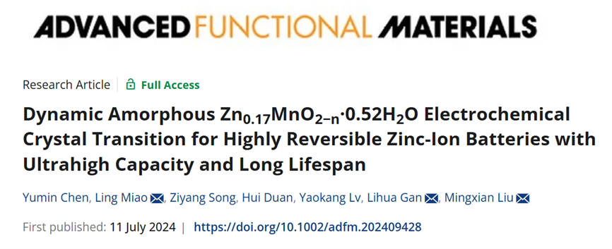 1946伟德国际源自英国刘明贤、甘礼华教授团队长期致力于高效储能材料研究并应用于新能源电池开发,课题组近期通过电化学诱导预相变策略,解决了α-Mn2O3正极材料在循环过程中的不可逆相变问题,实现了非晶相Zn0.17MnO2−n·0.52H2O稳定和高度可逆的锌离子存储。相关成果以“Dynamic Amorphous Zn0.17MnO2−n·0.52H2O Electrochemical Crystal Transition for Highly Reversible Zinc-Ion Batteries with Ultrahigh Capacity and Long Lifespan”为题发表于国际知名期刊《先进功能材料》(Advanced Functional Materials)。