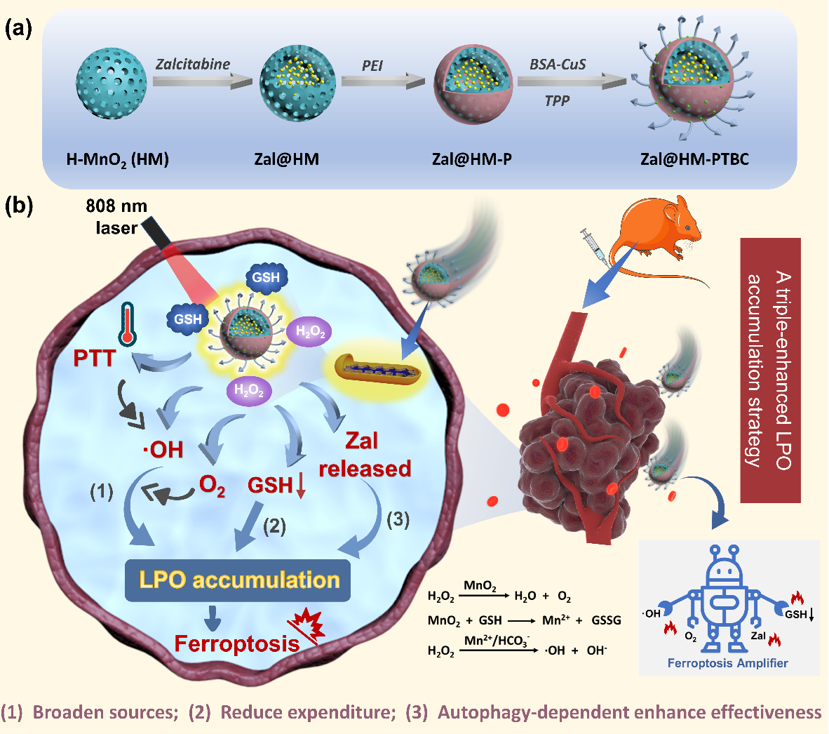 在这项研究中,研究人员通过硬模板法合成了具有中空结构的二氧化锰(HM)作为纳米核心,搭载药物扎心他滨(Zal)后,经进一步表面功能化,获得铁死亡放大器(Zal@HM-PTBC)。所合成的铁死亡放大器具有优异的TME响应降解性能,从而触发O2、Mn2+及Zal的释放。释放的Mn2+催化H2O2产生·OH,结合808 nm激光辅助的光热转换对Mn2+介导的类芬顿反应的加速作用,实现ROS扩增。相关实验表明升高的O2和ROS含量有助于协同促进LPO的生成(开源作用),同时Zal@HM-PTBC介导的GSH消耗削弱了GPX4的活性,导致LPO清除下降(节流作用),Zal的响应性释放促进了自噬依赖性LPO的积累(增强作用)。基于以上三重增强策略,Zal@HM-PTBC在体内外均表现出显著增强的铁死亡活性,结合光热治疗有效抑制了肿瘤的生长,为胰腺癌的治疗提供了可供借鉴的新思路。