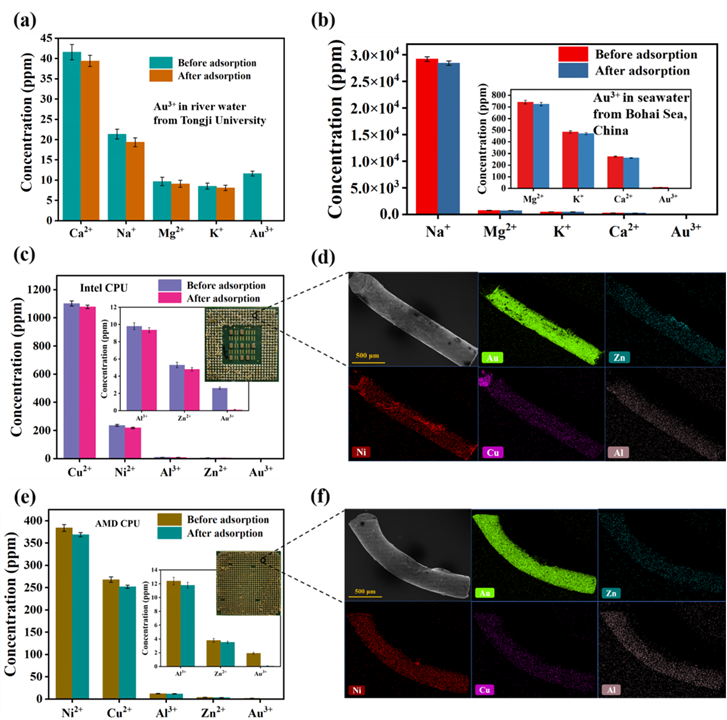 闫冰教授团队合成的这例吖啶基COF材料探针拥有高比表面积,丰富的吡啶N位点,良好的热稳定性和化学稳定性。该探针对Au3+展现出良好的荧光选择性,Fe3+、Fe2+ 和 Cu2+均不能使材料的荧光猝灭。此外,该课题组首次发现合成的探针能够在低浓度范围内(0.1-1.5ppm)实现对Au3+的比色传感。更重要的是,该材料还能实现对金离子的高效吸附。即使在复杂的环境中(同济河水、渤海海水和CPU提取液),合成的材料仍对金离子展现出高吸附效率(>96%)。一系列实验表征和DFT计算表明化学配位和Au(III)到Au(0)的降解是其主要吸附机理。该项工作表明吡啶N与Au3+有着良好的亲和力,拓宽了亚胺类COF在金离子的传感和吸附领域的应用,对于推动COF材料在各项技术领域的开发和利用具有重要的启示作用。