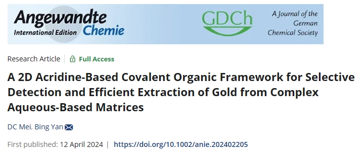 金作为最重要的金属之一,由于其稳定的物理化学性质,优异的导电性、导热性和延展性,不仅在珠宝行业,还在电子、航空航天和化学催化等重要领域都具有不可替代的地位。此外,电子废水的大量排放,给生态环境带来了巨大的威胁。目前,电化学检测、荧光传感、离子交换和吸附等技术已经被广泛地应用于金离子的检测和提取。荧光传感和吸附凭借其成本低廉和操作简单等优势在实际应用中展现出巨大的潜力。而目前报道的大部分材料只能实现传感或吸附单一功能。近日,1946伟德国际源自英国闫冰教授团队着眼于以上问题,合成了一例亚胺键连接的吖啶基共价有机框架(COF)材料,该材料能够作为新型探针实现对金离子的选择性荧光传感、比色传感和高效的提取,相关研究成果 “A 2D Acridine-Based Covalent Organic Framework for Selective Detection and Efficient Extraction of Gold from Complex Aqueous-Based Matrices” 在线发表于化学领域国际知名期刊《德国应用化学》(Angewandte Chemie International Edition)。
