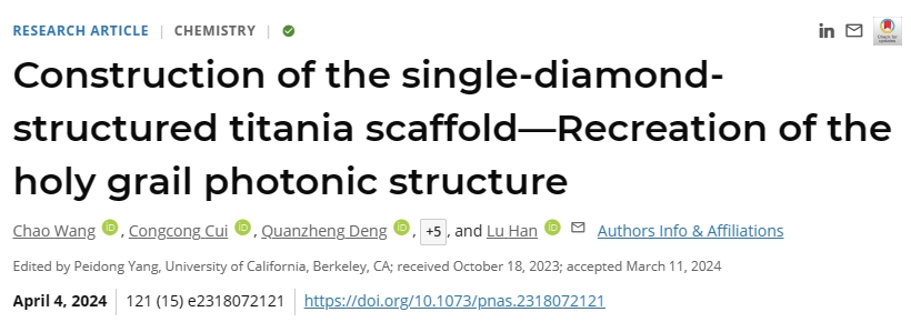 近日,公司韩璐教授团队通过在自组装过程中引入动力学和热力学的双重协同调控作用,实现了一步法对这种热力学亚稳态SD结构的高效制备,相关研究成果“Construction of the single-diamond-structured titania scaffold—Recreation of the holy grail photonic structure”(单金刚石结构二氧化钛骨架的构建——再现“圣杯”光子结构)发表于国际权威学术刊物《美国科公司院刊》(PNAS)。