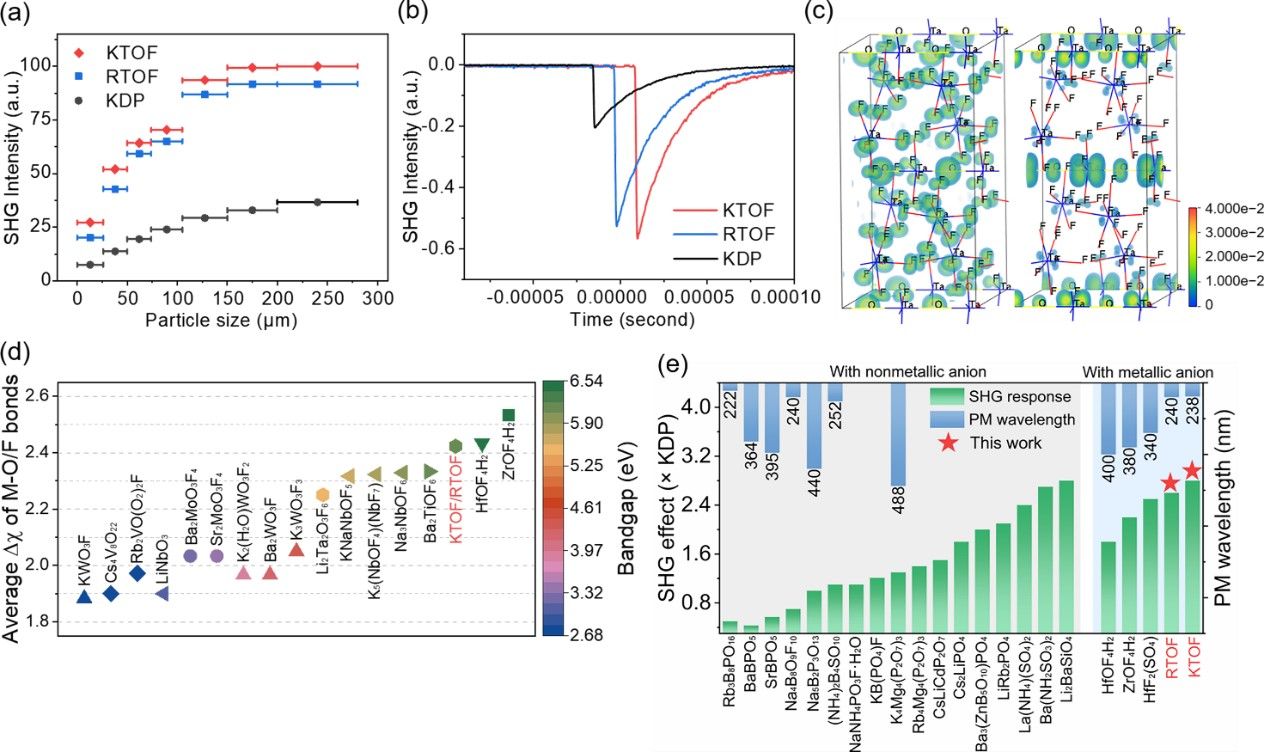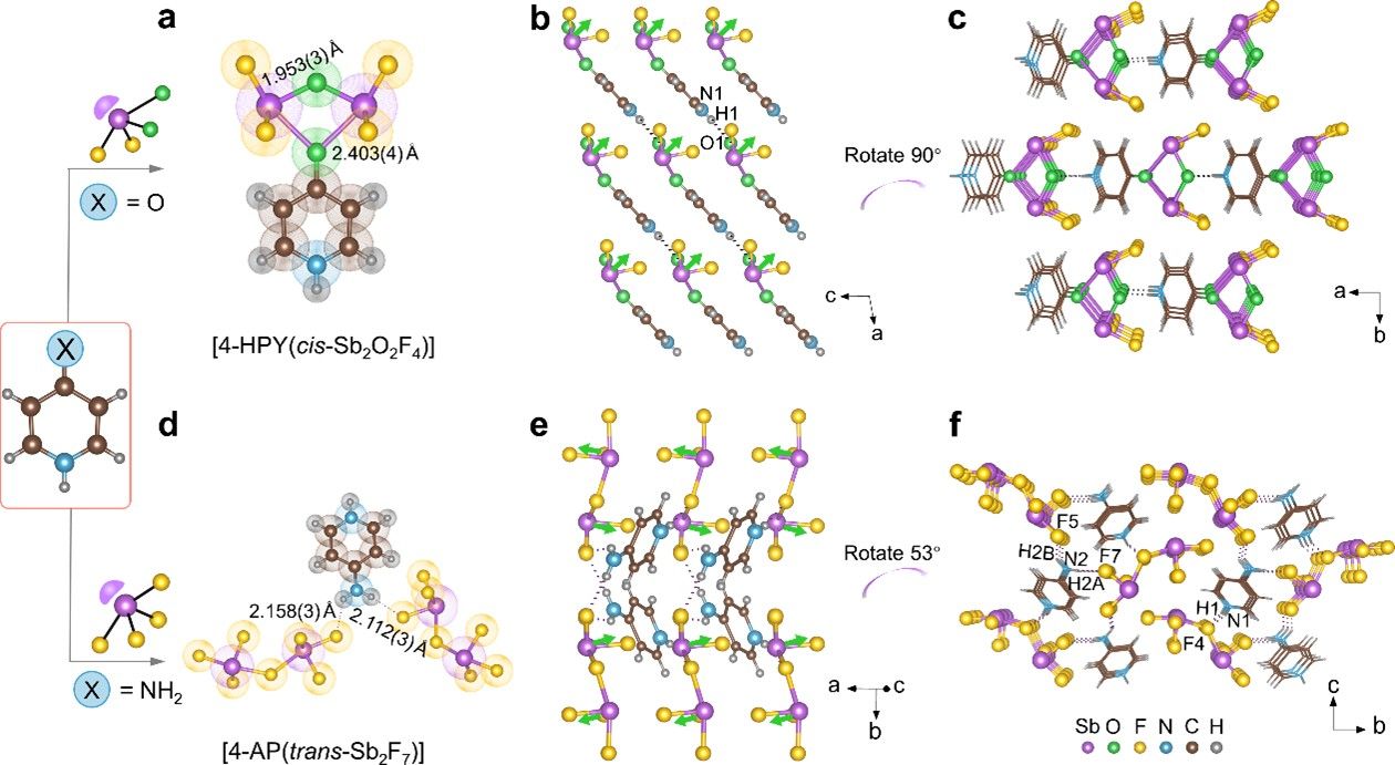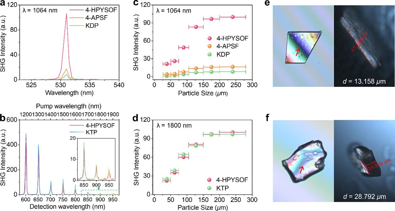 研究团队还运用单晶结构X射线衍射分析结合第一性原理理论进行模拟计算,深入探讨并阐明了4-HPYSOF可实现强倍频效应和大双折射率可归因于由极化离子键控制的顺式锑基二聚体[4-HPY(cis-Sb2O2F4)]的一致极化取向。实验研究显示,相较于由反式锑基二聚体[4-AP(trans-Sb2F7)] (该二聚体由氢键控制)组成的晶体材料4-APSF4-HPYSOF晶体在可见光(12 × KDP @ 1200 nm)和红外光(1.0 × KTP @ 1800 nm)区域均表现出强的二次谐波响应,同时具有足够大的双折射(0.513 @ 546 nm)和短的紫外吸收截止边(270 nm)。该项研究对于创新研制新型高性能紫外光学倍频晶体具有极为重要的科学意义和示范作用。