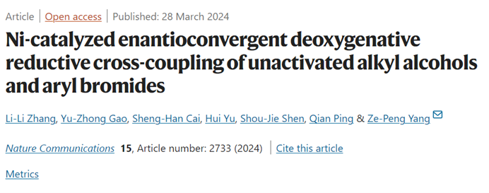 烷基醇是自然界中广泛存在的一类化合物,来源十分丰富。通过断裂醇的碳—氧键和芳基卤化物直接进行偶联能够快速获得高附加值化合物,然而碳—氧键的高解离能限制了烷基醇作为偶联试剂的应用。尽管近年来发展了若干策略来实现其参与的偶联反应,但不对称反应至今没有被深入研究。董哲及MacMillan团队发展了NHC(N-杂环卡宾)活化碳—氧键的策略(Nature 2021, 598, 451–456),公司杨泽鹏教授课题组借助该策略开展深入研究。近日,该课题组实现了一例非活化烷基醇(β-羟基酮)与芳基溴的立体汇聚式脱氧还原偶联反应,相关研究成果“Ni-catalyzed enantioconvergent deoxygenative reductive cross-coupling of unactivated alkyl alcohols and aryl bromides”在线发表于国际知名期刊《自然·通讯》(Nature Communications)。
