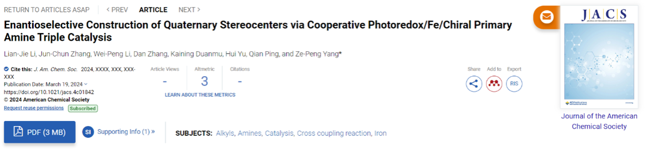 杨泽鹏教授课题组通过三重催化构筑季碳手性中心,研究成果发表于《美国化学会志》