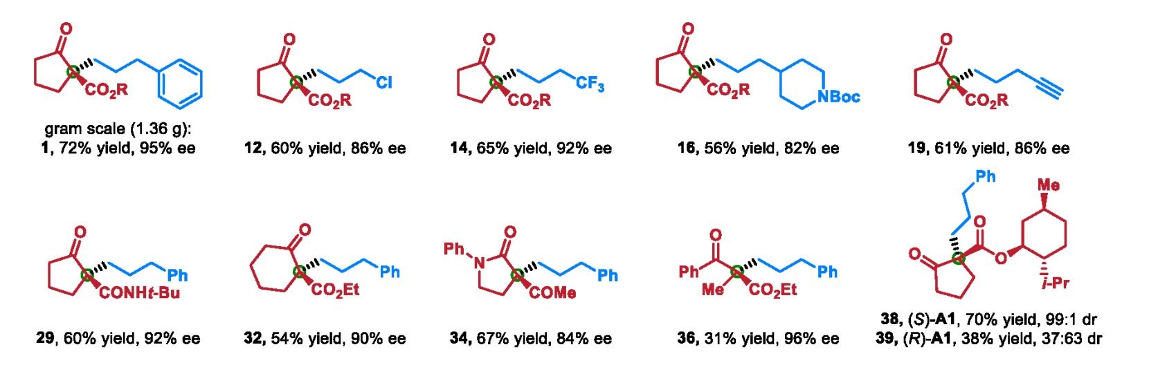在最优条件下,研究人员探索了与不同NHP酯的偶联反应,在无碱环境下合成了一系列含季碳手性中心的化合物,可兼容多种取代基,包括芳环(杂芳环)、非活化烷基氯/溴、三氟甲基、醚、Boc胺、酯、内烯烃和末端炔烃等多种官能团。同时,许多1,3-二羰基化合物均表现出良好的反应活性及选择性。克级反应表明,该方法能以优秀的收率及对映选择性控制得到目标产物,实用性较强。研究人员深入探讨了反应机理,提出了可能的催化循环。