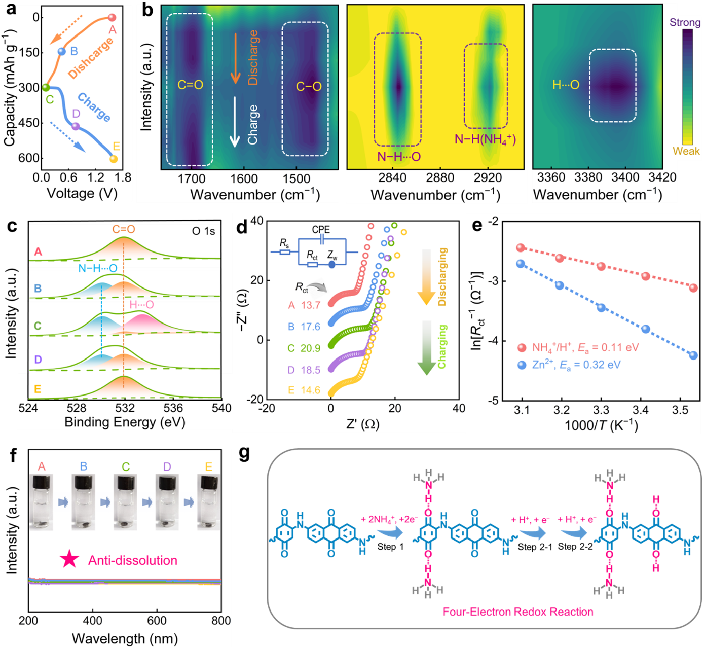 研究人员通过异位光谱研究,表明高度稳定的有机超结构能有效抑制活性官能团溶解,充分暴露羰基电活性中心,引发高度可逆的氧化还原反应;同时有机超结构克服了Zn2+去溶剂化能垒过高引起的动力学迟滞问题,促进了超稳定和快速的两步四电子NH4+/H+电荷载体共存储。