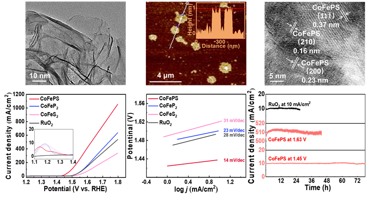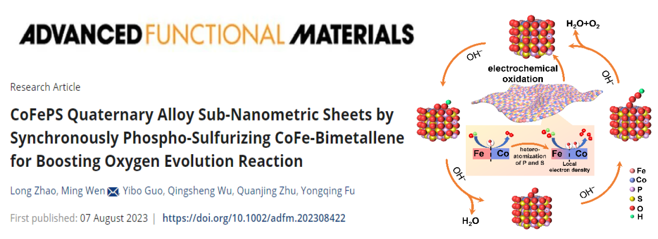 电催化水解产氢是获得可持续高纯度清洁能源氢气的有效途径之一。然而,水解过程中析氧反应(OER)因较高的反应能垒和复杂的电子转移过程往往表现出缓慢的动力学,同时OER活性较高的贵金属催化剂使得商业电解水成本居高不下。近年来,具有高活性低成本的过渡金属OER电催化剂成为能源领域和电化学研究的前沿和热点。公司温鸣教授团队致力于破解该难题,根据二维亚纳米超薄结构能在有效增加电解质与催化剂接触表面积的同时获得活性位点的充分暴露,为构筑高效超薄结构的多元合金OER电催化剂的发展提供了新思路。近日,相关成果以“CoFePS Quaternary Alloy Sub-nanometric-sheets by Synchronously Phospho-sulfurizing CoFe-bimetallene for Boosting Oxygen Evolution Reaction” 为题在线发表于材料科学领域国际著名学术期刊《先进功能材料》(Advanced Functional Materials, 2023, doi.org/10.1002/adfm.202308422)