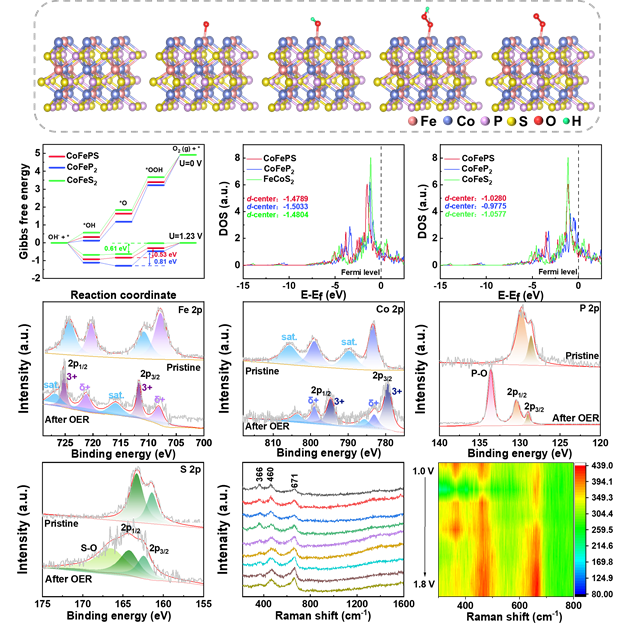 理论计算和原位分析表明双贱金属烯同步硫磷化所获得的CoFePS四元合金,可以减小限速步骤的反应能垒;优化了电子结构,增强了电子转移能力。此外,OER过程中电化学重构后表面形成活性磷硫酸盐壳层,使其对反应中间体的吸附能力更适中,从而展现出优异的OER性能。