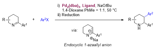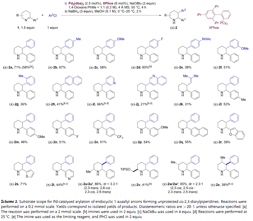 在前期研究基础上,作者由哌啶出发通过两步反应合成了底物2-芳基-1-哌啶亚胺。通过叔丁醇钠去质子化,2-芳基-1-哌啶亚胺原位生成相应的环内1-氮杂烯丙基负离子,并在Pd2(dba)3/XPhos催化下与芳基氯发生偶联反应得到2,3-二芳基-1-哌啶亚胺,随后通过硼氢化钠还原以中等至较高的收率和高非对映选择性得到氮原子无保护的顺式2,3-二芳基哌啶。该反应适用于烯基氯、含有杂芳基的底物,以及多取代1-哌啶亚胺底物。由于环内1-氮杂烯丙基负离子是两可的亲核中间体,对于大多数底物反应还同时得到少量N,3-二芳基化烯胺副产物。