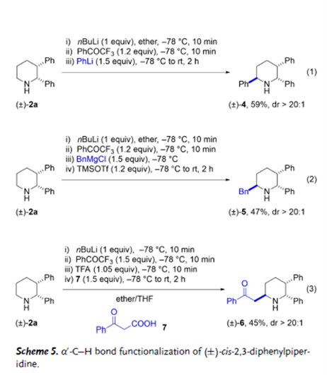 图4. 无保护顺式-2,3-二芳基哌啶的区域选择性α’-C–H键官能团化(图片来源:Angew. Chem. Int. Ed.)