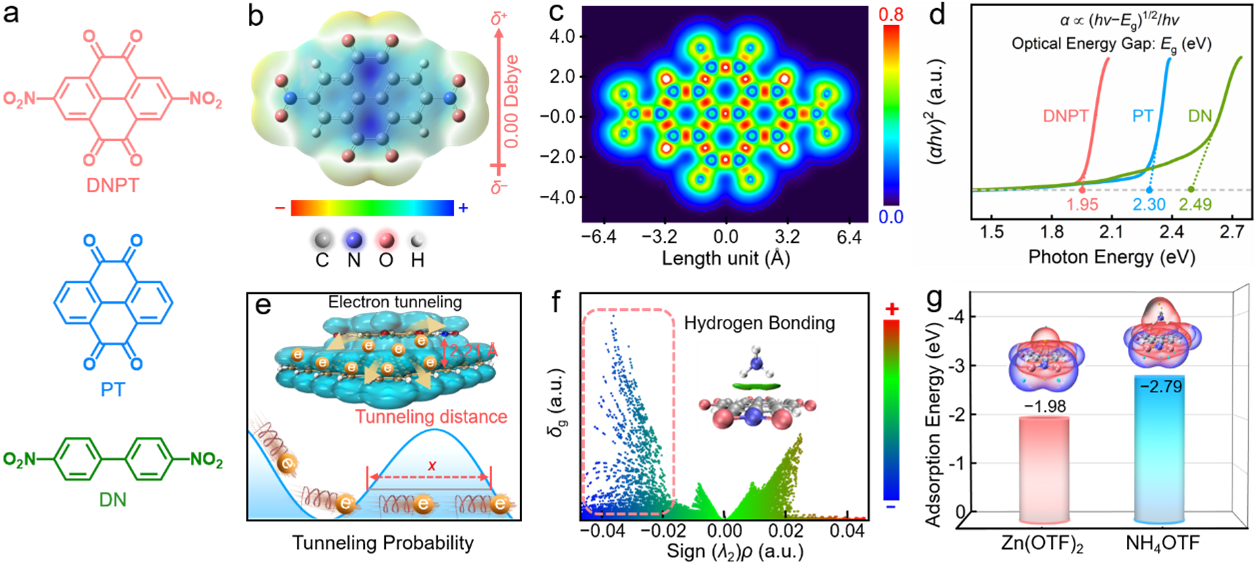 分子动力学模拟和紫外光谱研究表明:高度稳定的氢键网络有效抑制活性官能团溶解,充分暴露羰基/硝基活性中心,克服Zn2+去溶剂化能垒过高引起的动力学迟滞问题,有效降低NH4+扩散迁移/反应势垒,促进超稳定和快速NH4+电荷载体传输。
