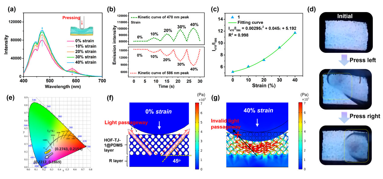 近期,该课题组合成了一例离子型氢键有机框架(HOF-TJ-1)蓝光材料,并通过阳离子交换的方法合成了具有红、黄、绿三种发光颜色的Dye@HOF材料。受蓝环章鱼的皮肤变色行为启发,团队提出了一种发光力敏仿生皮肤传感器的概念,即使用PDMS材料合成了四种HOF基具有三重力致变色响应的皮肤传感器(1−4)。在拉伸过程中,1−3的发光颜色从最初的蓝色变为红色、黄色、绿色,4表现出增强的蓝色发射。在0−40%的压缩应变下,1−4的蓝色发射增强。该传感器上层具有多孔结构,在拉伸,弯曲和压缩的过程中,1−4表现出了超低的检测限和极好的可重复性。通过有限元仿真模拟计算,三种力致变色响应(拉伸,弯曲和压缩)的机理得到了合理的解释。基于1的发光力致变色响应,团队还进一步实现了三种智能应用,即手指运动传感、手势识别和触觉增强的手掌信息收集。该工作以“Bioinspired HOF-based luminescent skin sensor with triple mechanochromism responses for recognition and collection of human biophysical signals”为题在线发表在《材料地平线》(Materials Horizons)上(https://doi.org/10.1039/D3MH00096F)。公司在读博士生徐鑫是论文第一作者,闫冰教授是通讯作者。该研究得到国家自然科学基金的资助和支持。
