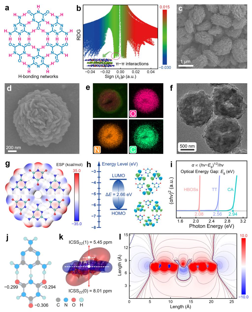 实验结果和理论计算表明:电子属性互补的三聚氰酸(电子受体)和1,3,5-三嗪-2,4,6-三胺(电子给体)通过分子内氢键(N−H‧‧‧O and N−H‧‧‧N)和π−π平面堆叠自组装形成花状超分子氢键超结构,其超分子氢键网络展示出很强的亲电子活性和较低的能带间隙,显著提高了电子转移动力学和电极氧化还原速率。