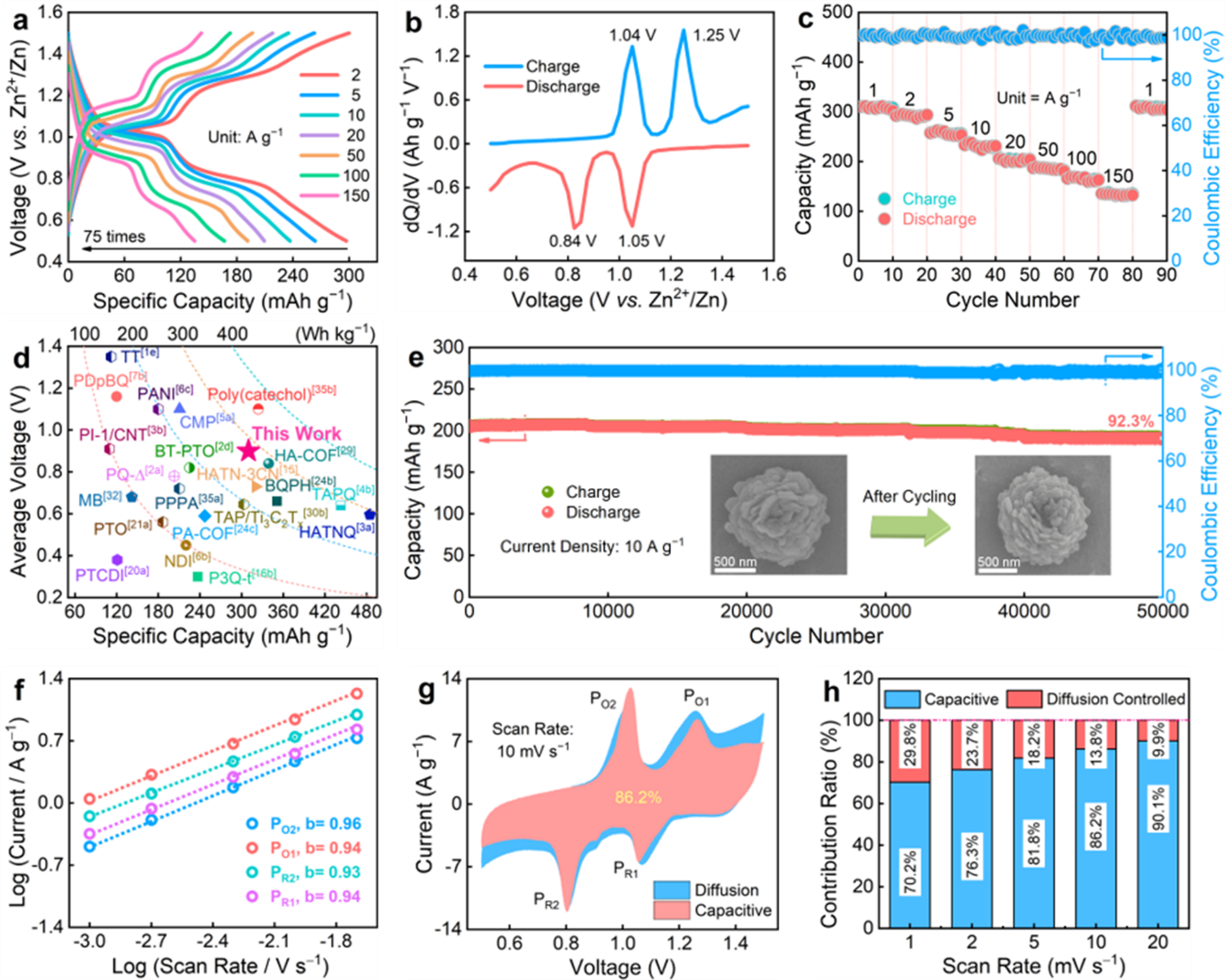 超分子氢键有机超结构材料用于水系锌-有机电池时,表现出高比容量(311 mAh g−1@1A g−1)、高倍率性能(135 mAh g−1@150 A g−1)和长循环稳定性(50,000次充放电后容量保持率为92.3%)。这项研究为解决有机材料的固有问题,构建高性能锌-有机电池提供了一种新的策略。