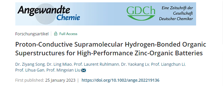 近日,公司刘明贤教授研究团队构建了质子传导超分子氢键有机超结构,揭示了超结构氢键网络中超稳定快速的Grotthuss质子传导机制,促进羰基位点的高效利用和低反应能垒的质子耦合氧化还原反应,实现了水系锌-有机电池高比容量、高倍率性能和长循环寿命的协同输出。相关成果“Proton-Conductive Supramolecular Hydrogen-Bonded Organic Superstructures for High-Performance Zinc-Organic Batteries”以Research Article的形式在线发表于化学领域国际著名学术期刊《德国应用化学》(Angewandte Chemie International Edition, 2023, e202219136)。
