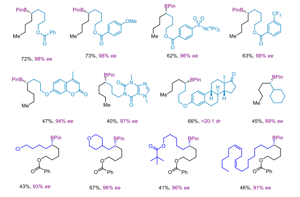 在最优条件下,研究人员对反应的适用范围进行了考察。结果表明,反应对各类官能团如酯、醚、氰基、磺酰胺、三氟甲基、酰胺、烷基氯化物以及多种天然产物衍生物等均有很好的兼容性。除此之外,二级碘化物在该反应中也能兼容。温和的反应条件也使得该方法用于复杂分子的后期修饰成为可能。研究人员还对反应的机理进行了深入的探讨,提出了可能的反应循环。