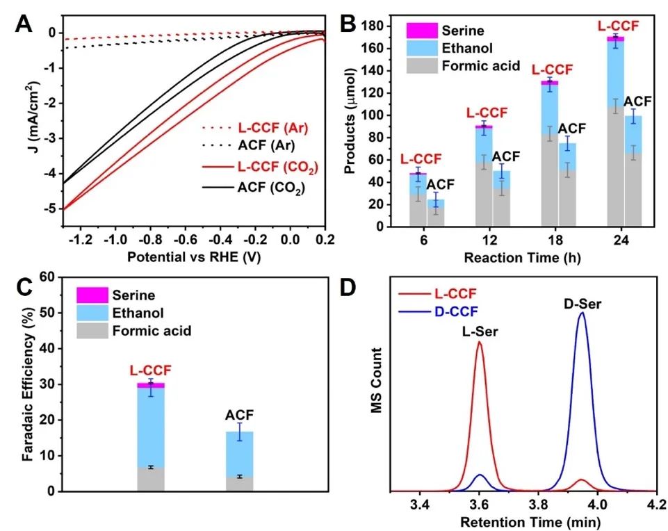研究人员进一步对合成的手性无机纳米铜膜进行了催化性能研究,通过-0.6~-1.3V vs RHE的CV经过24小时以后可以得到~3.8 (±0.6)、~58.6 (±6.5) 和~108.1 (±6.5) μmol的丝氨酸、乙醇和甲酸产物,法拉第效率为:~1.2 (±0.2)、~22.3 (±2.5) 和~6.8 (±0.4) %,其中丝氨酸的ee%可以达94%。